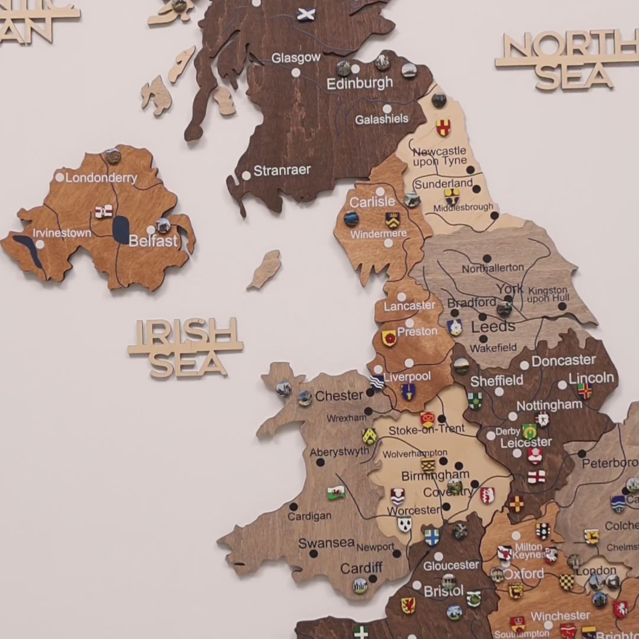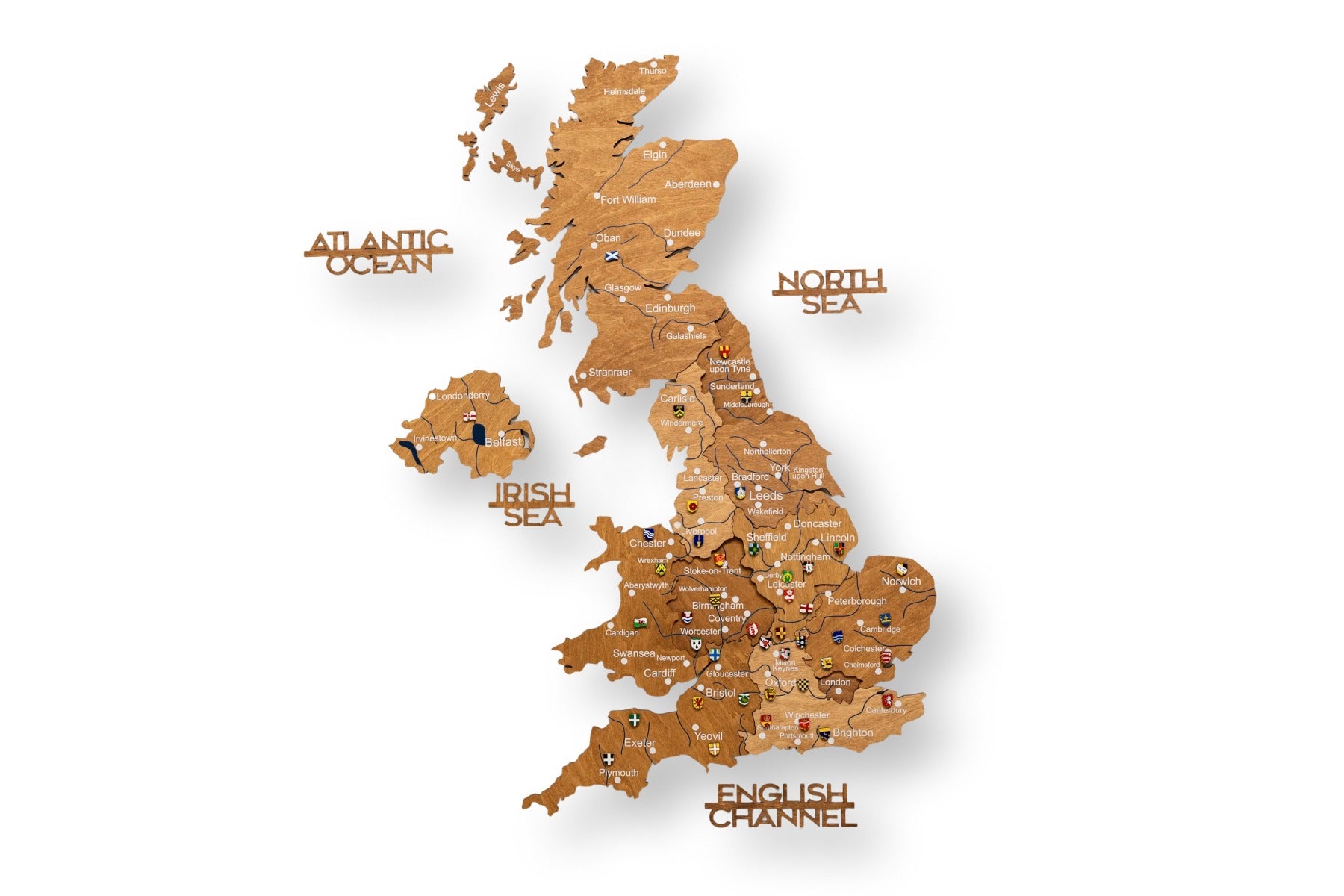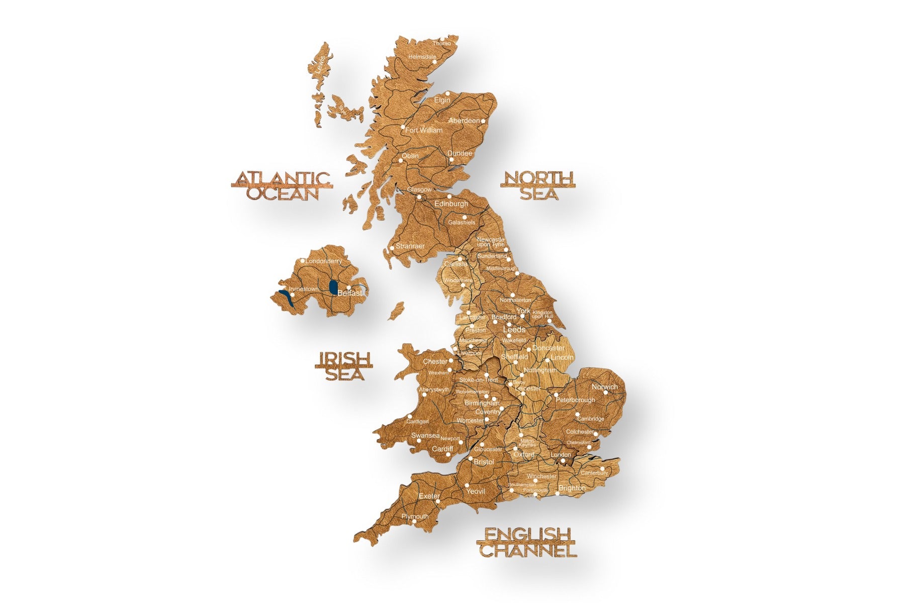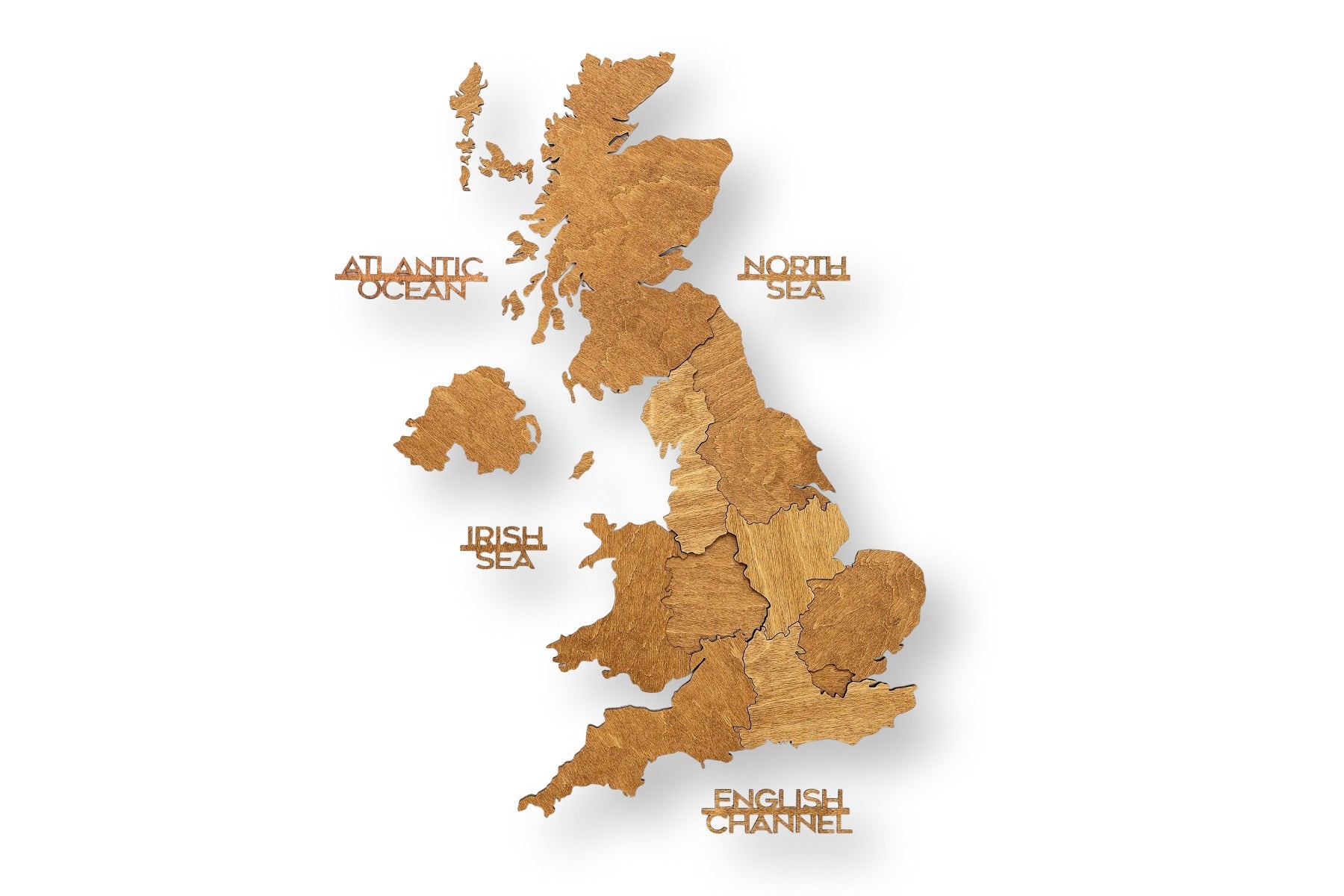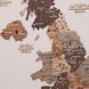 The oak finish accentuates the natural wood grain, lending the map a touch of rustic luxury. The 3D effect is created by carefully layering multiple wood levels, giving the map of Great Britain an impressive, dynamic depth. The clean design serves as a comprehensive representation of the countries within the map of Great Britain.
