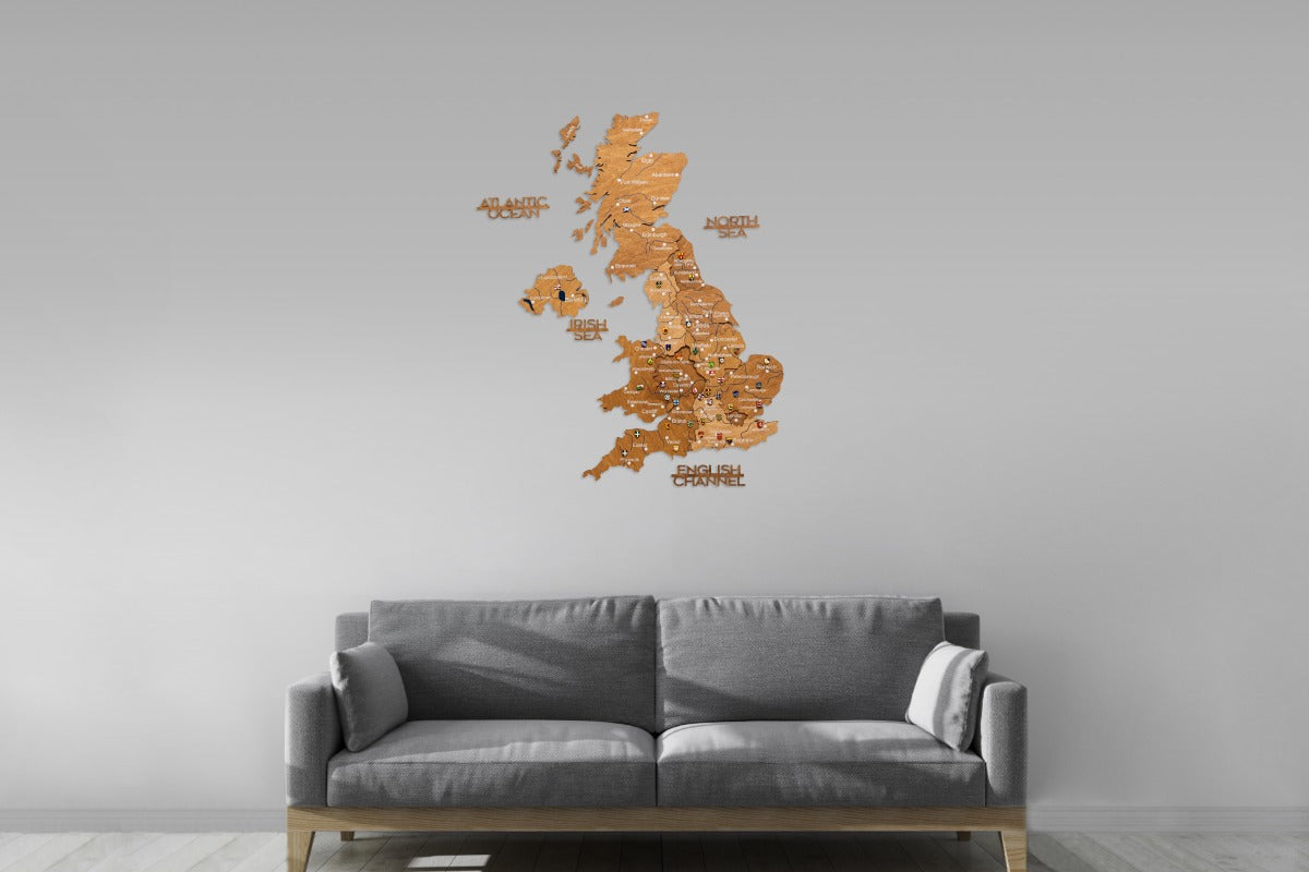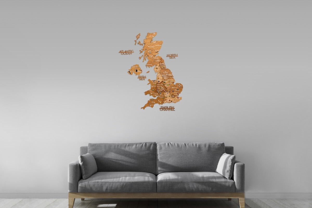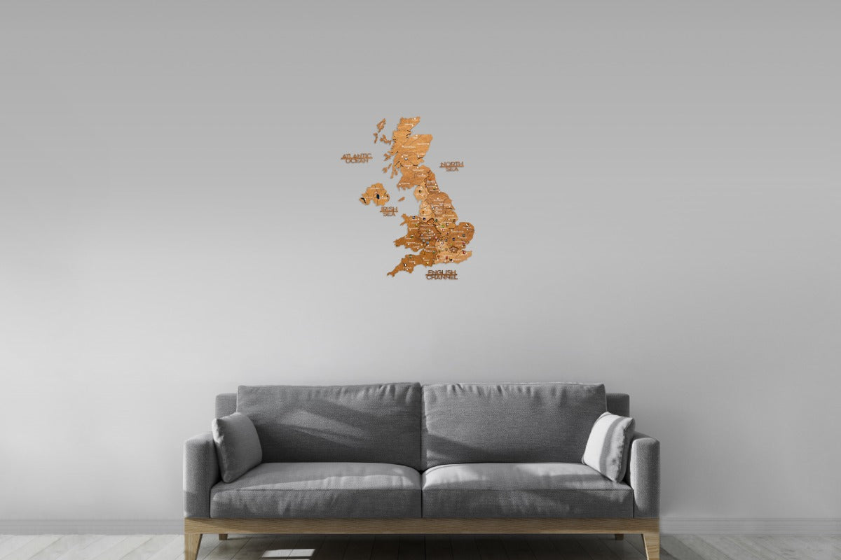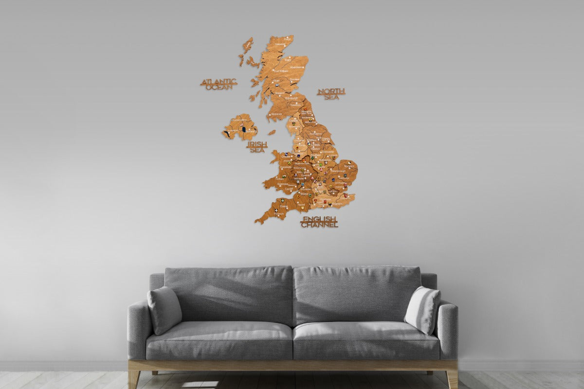 3D United Kingdom Wooden Map - Oak: Stylish wall map with colored wooden layers, detailed engraving, and impressive 3D depth. Ideal as decoration or travel diary.