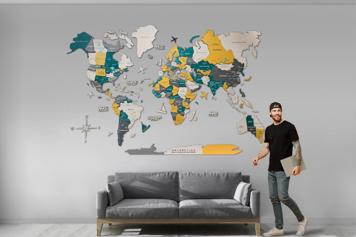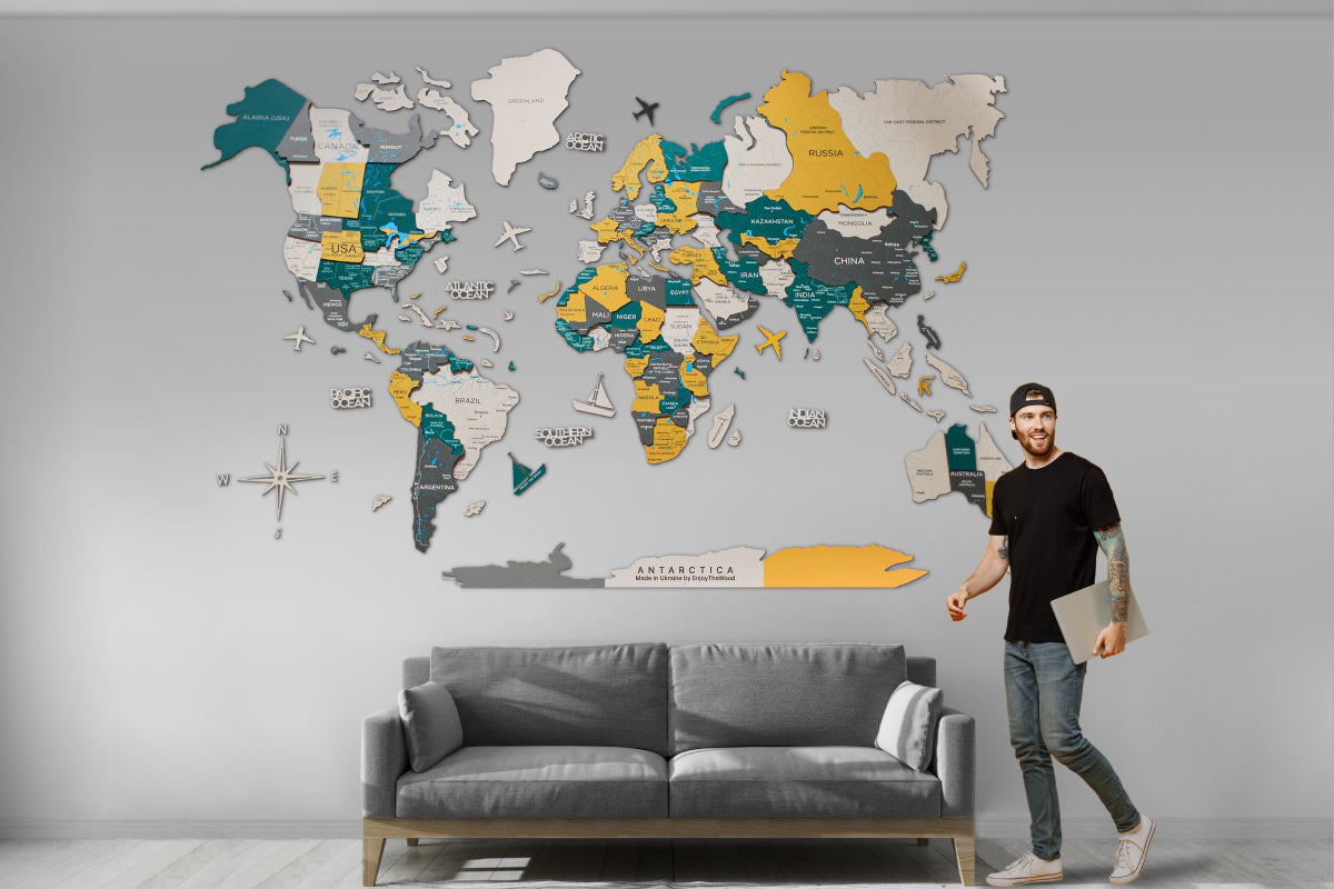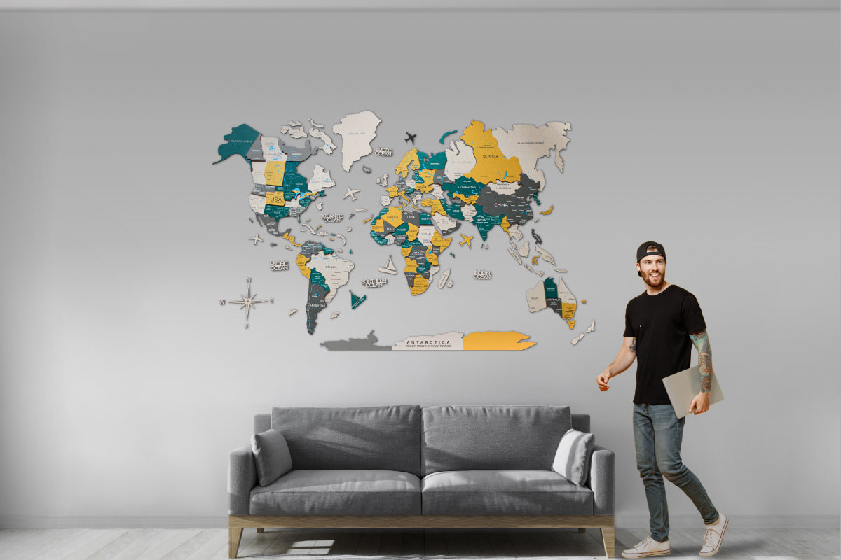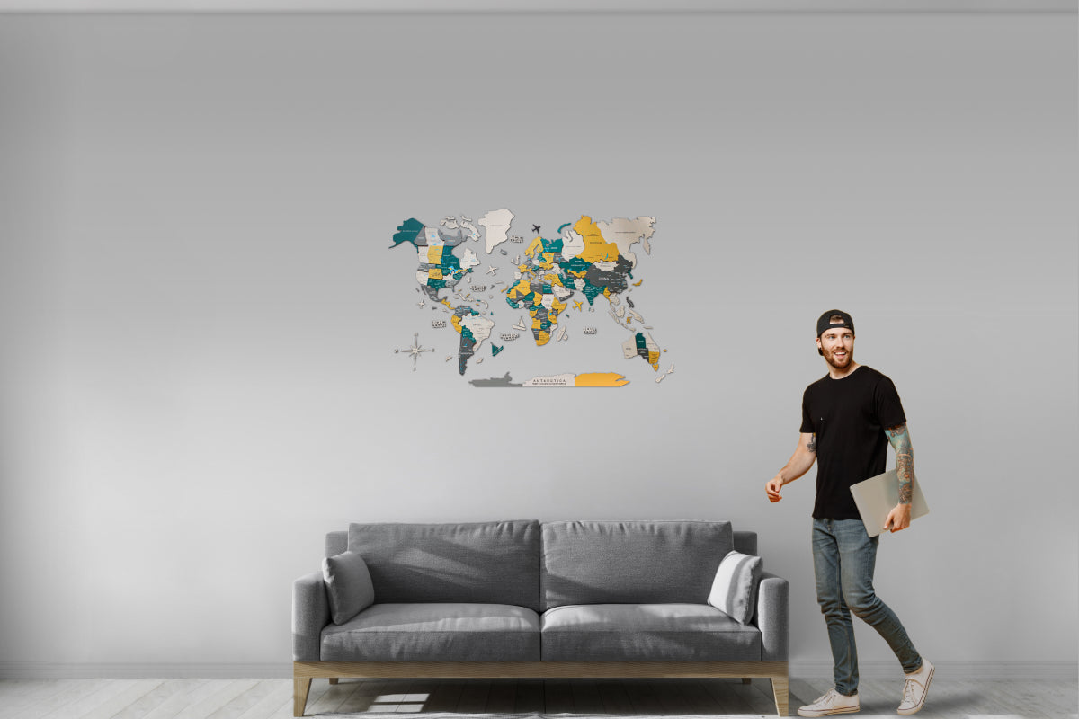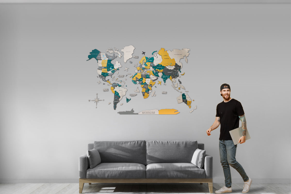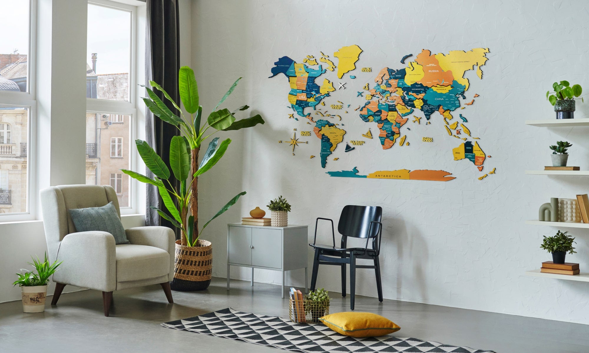 The colors of the "Country" 3D wooden world map have been carefully selected to complement a variety of interior design styles. Whether your decor is minimalist, rustic, modern-elegant, or eclectic – this map is available in various finishes that will harmoniously integrate into your existing aesthetic.