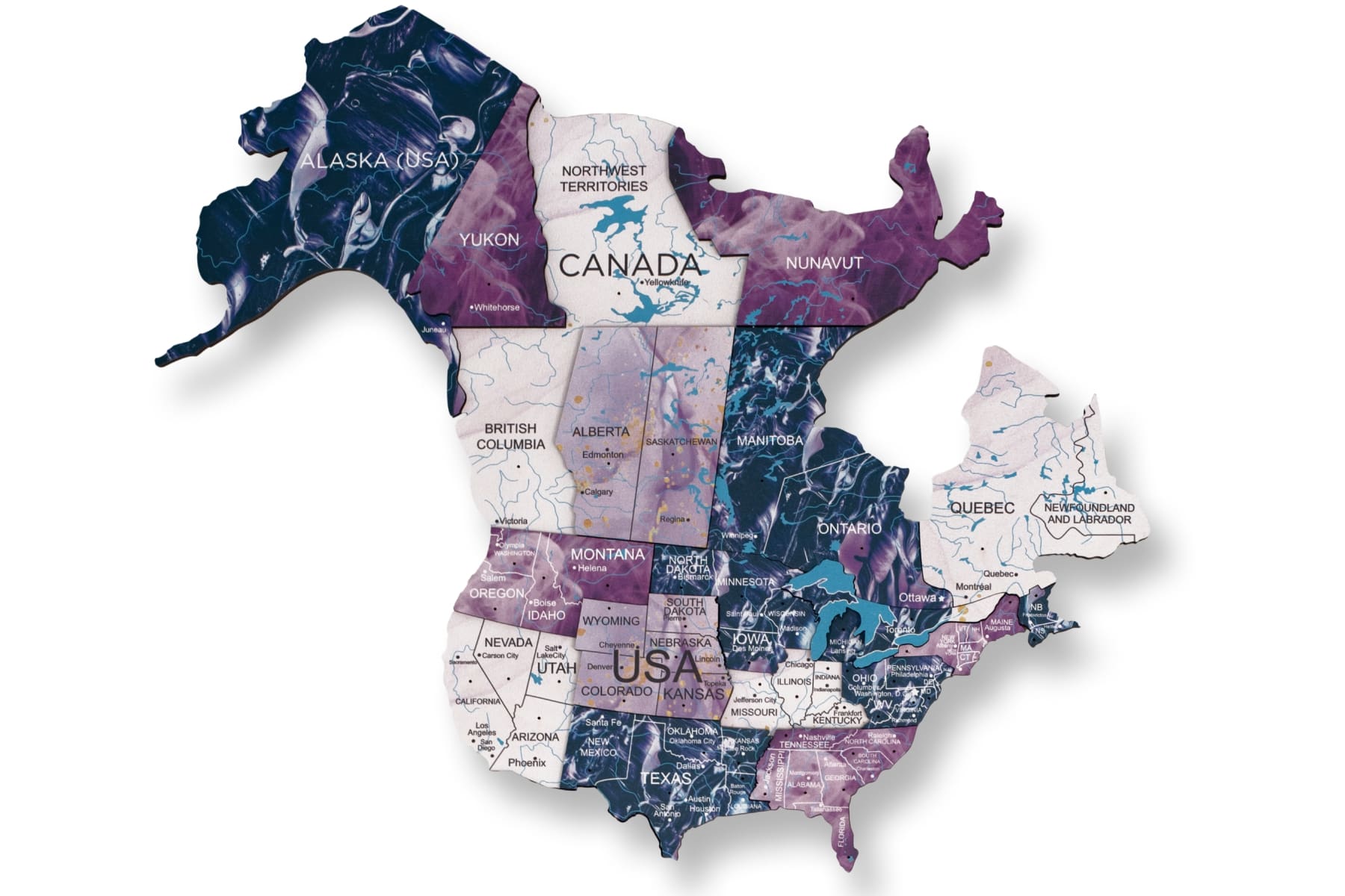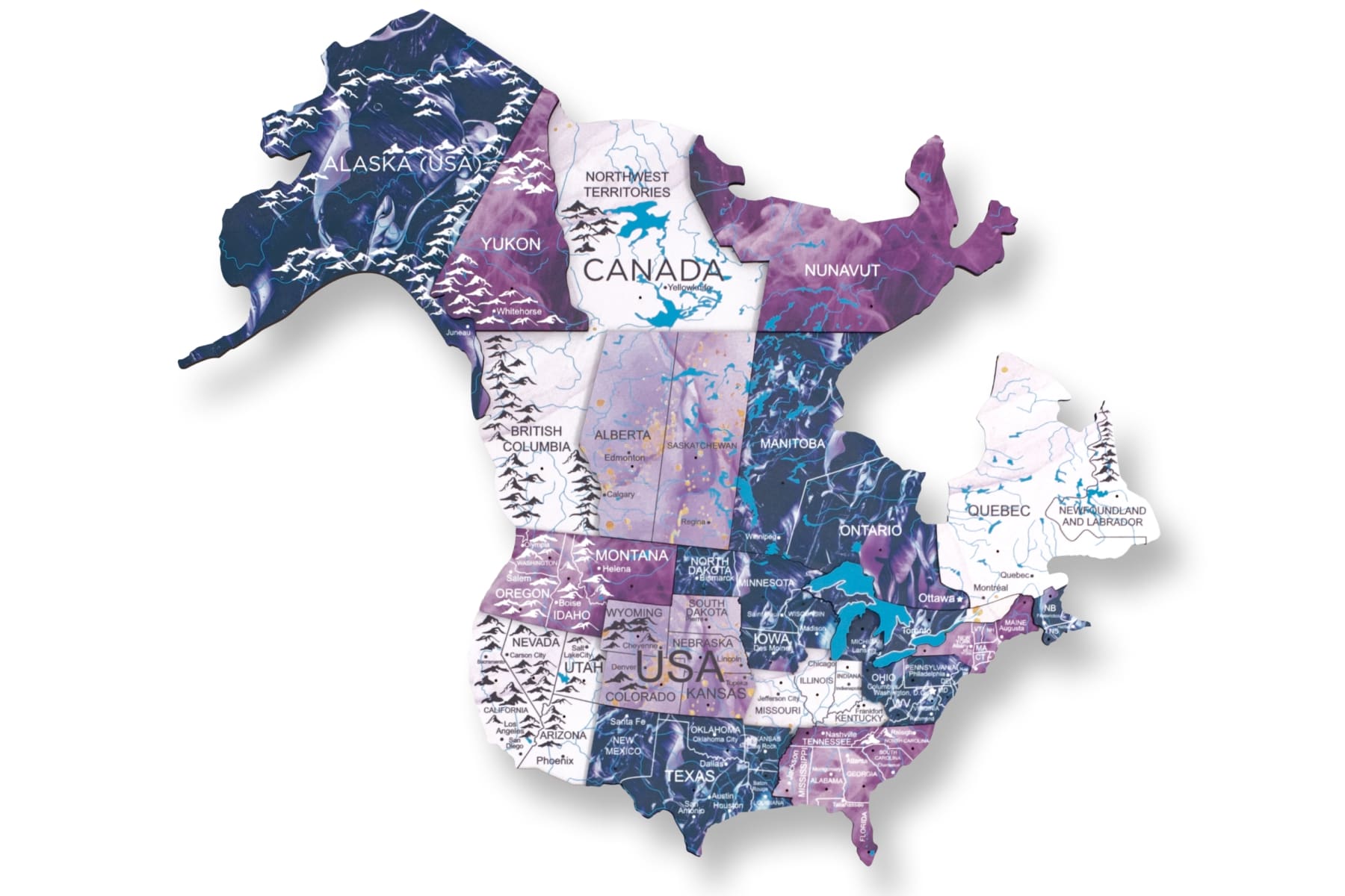 The world map painted on wood features various elements, from country names to capitals, cities, rivers, lakes, and mountain ranges. However, due to design decisions, some smaller islands and countries were not included, making the map unsuitable for educational purposes. To complete your purple world map, be sure to add these wooden flag pins to your cart.