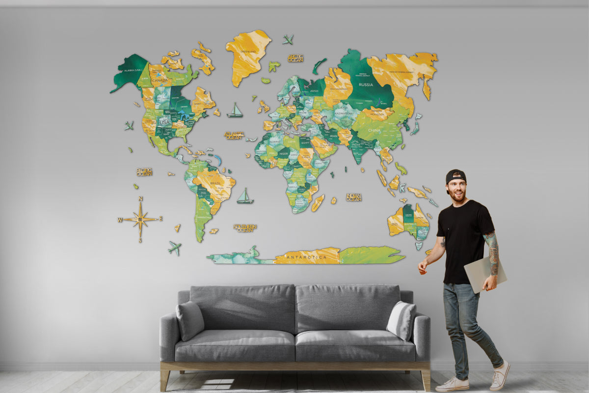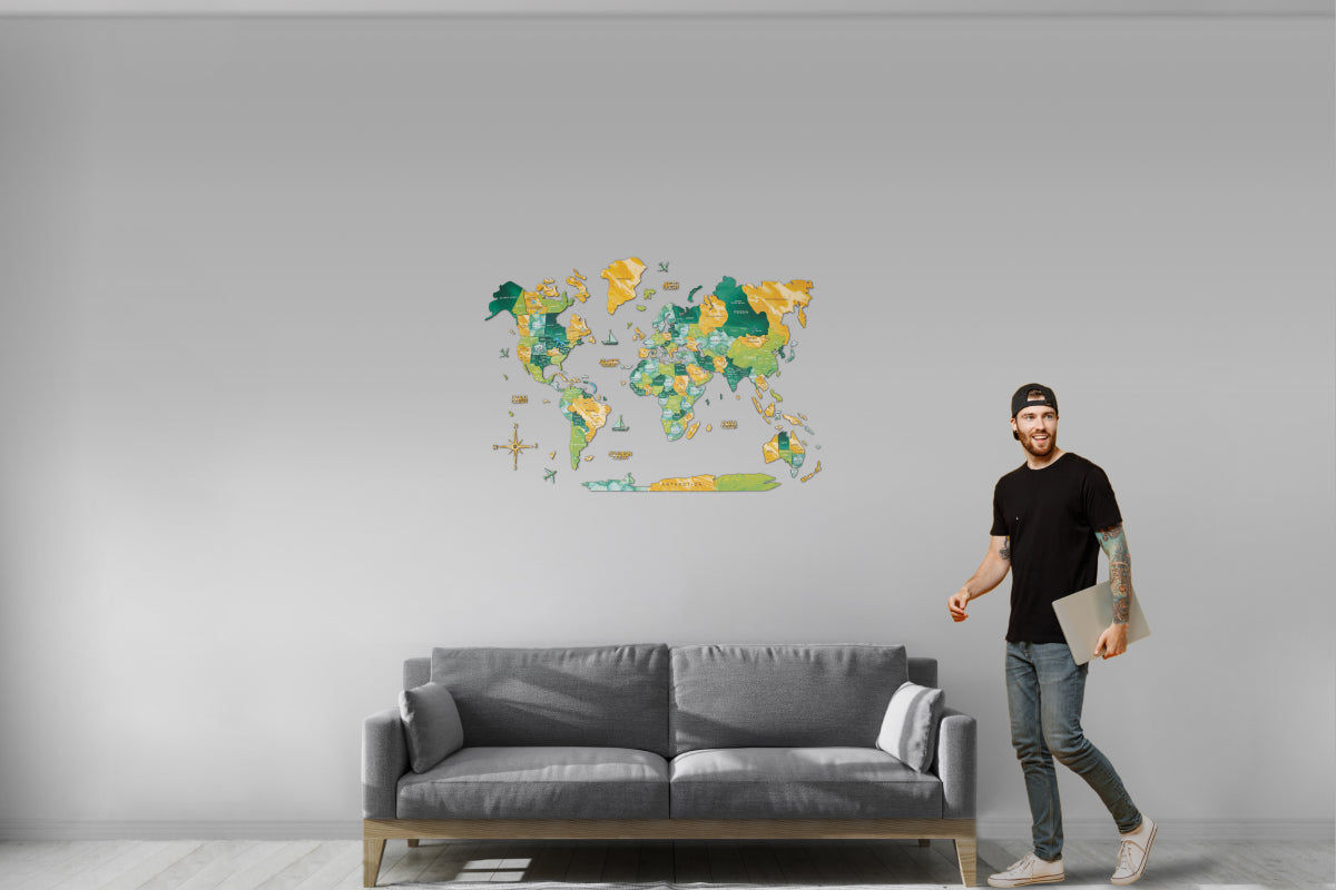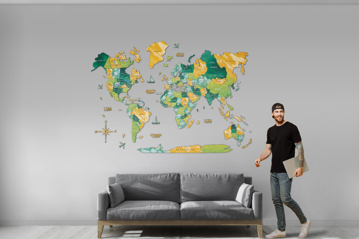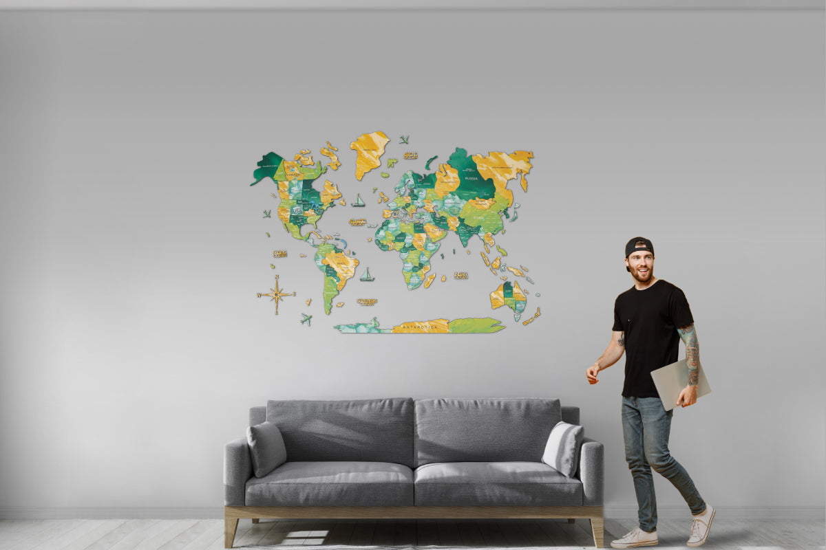 As the original manufacturers of wooden world maps, Enjoy The Wood offers you authentic products, supported by a strong patent portfolio, reaffirming our commitment to innovation and protection 🥇. The colorful 3D wall art, masterfully crafted from robust fiber wood, impresses with its eco-friendliness thanks to the absence of toxic coatings and is handmade with attention to detail to ensure long-lasting quality. Its adaptability to various surfaces and easy disassembly make it a durable and versatile addition to your home or office.