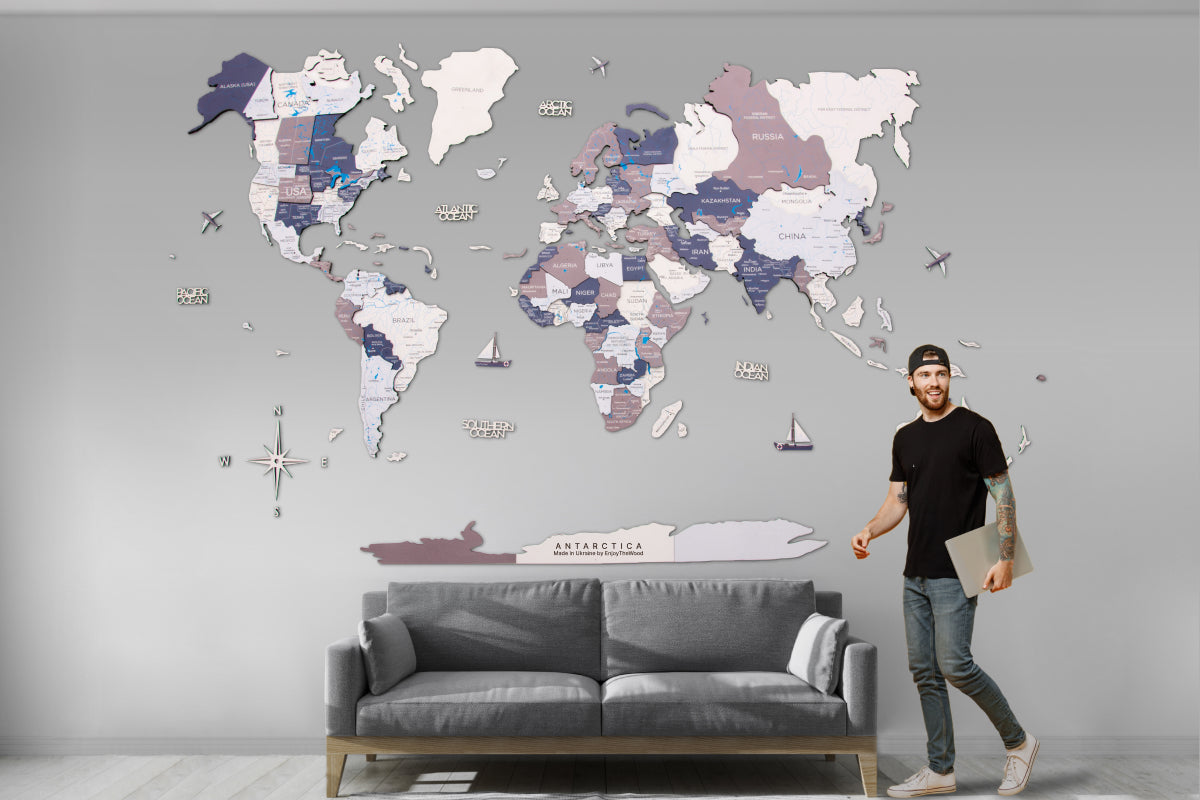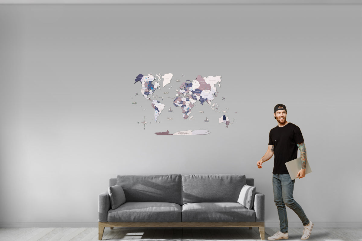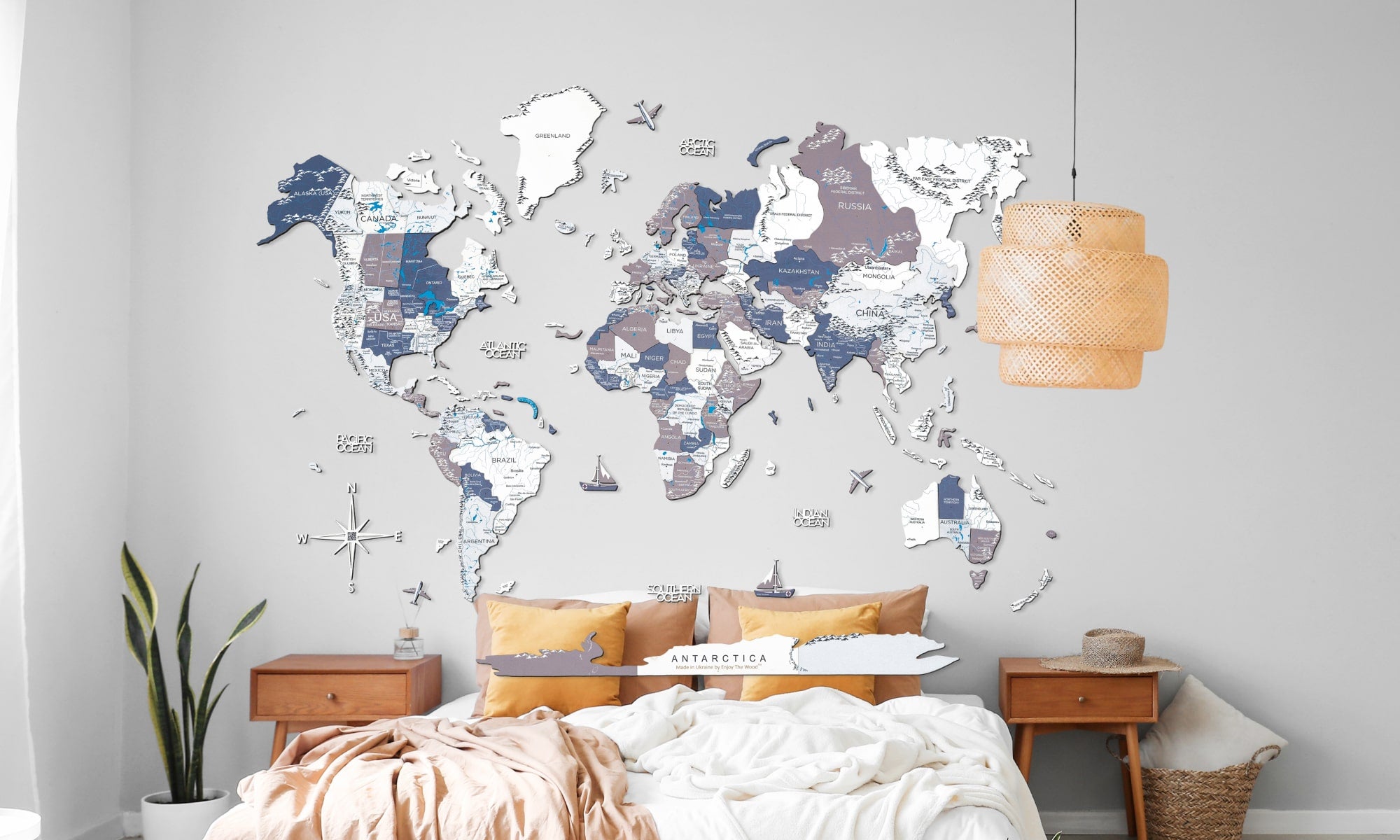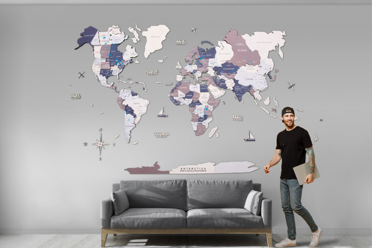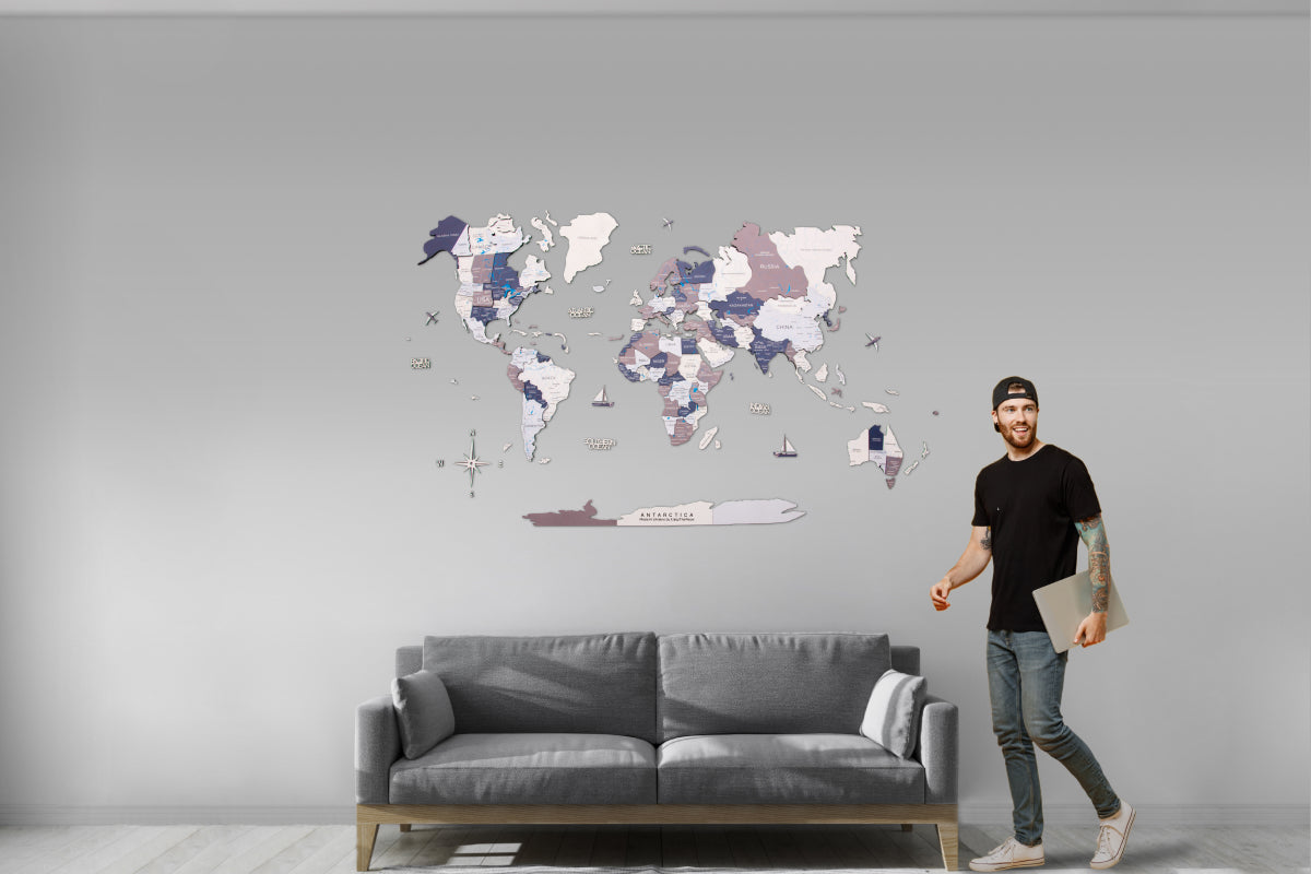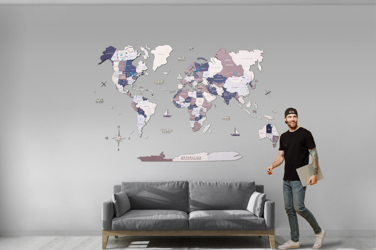 Die Weltkarte ist aus Fiberwood gefertigt und somit langlebig und widerstandsfähig. Auch ästhetisch wird sie niemals aus der Mode kommen. Du kannst das Element mit geografischen Standorten in jeder bevorzugten Sprache drucken lassen, außer in Hieroglyphen und seltenen Sprachen.