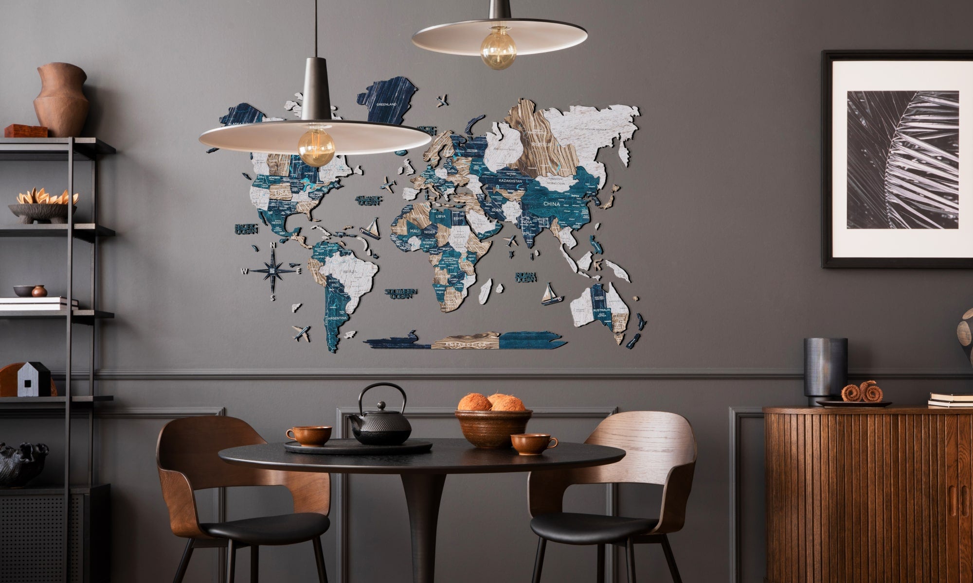 Schau dir einfach diese perfekte Kombination aus Grau, Blau, Dunkeltürkis, Braun, Weiß und … oh, die Vielfalt an Farben auf der Weltkarte aus der Mystery-Kollektion ist wirklich beeindruckend! Gleichzeitig haben wir unser Bestes gegeben, um sicherzustellen, dass die Farbpalette der auf Holz gemalten Weltkarte augenfreundlich ist und in jeden Raum passt.