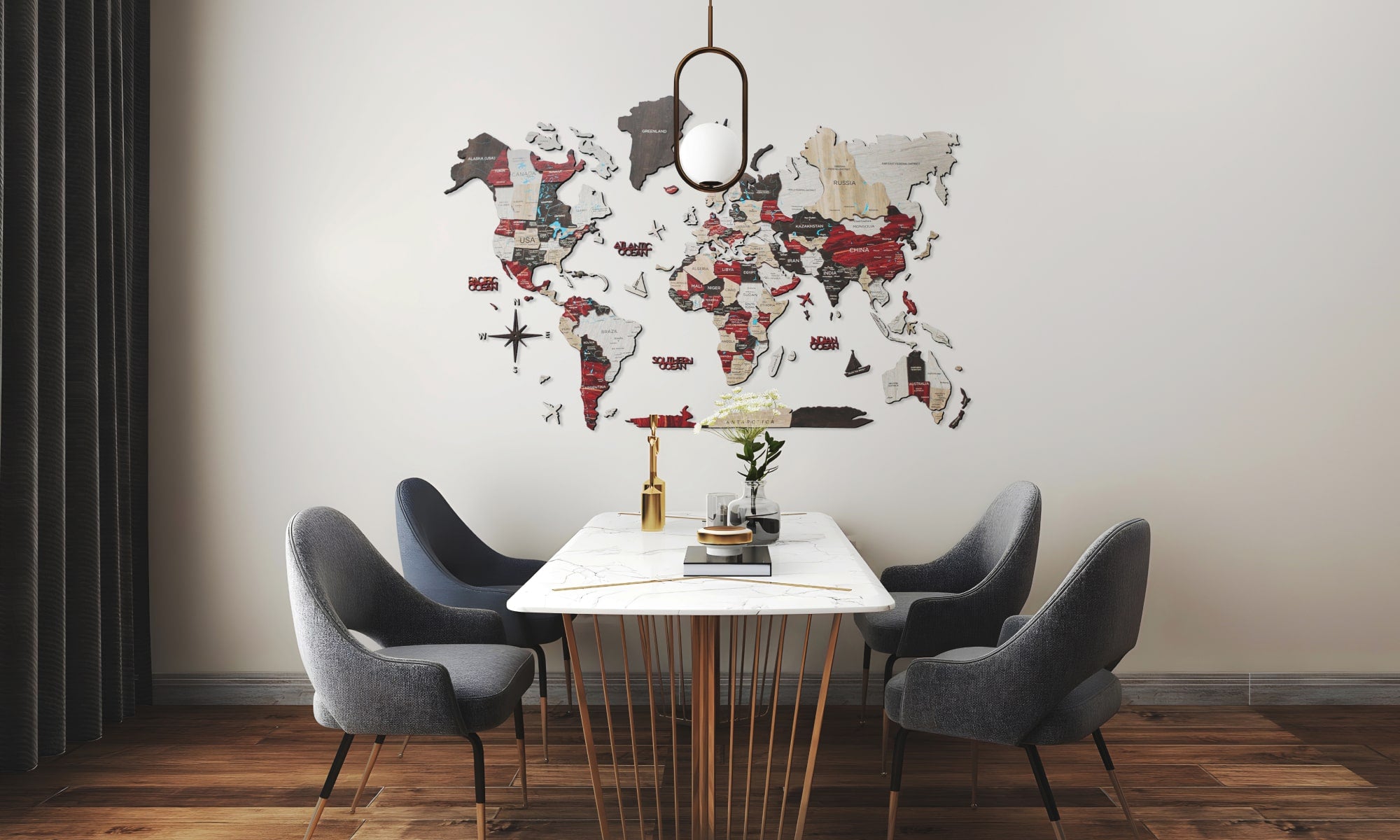 Der Hauptgrund, eine bunte Weltkartenkunst zu bekommen, ist, dass sie Interesse und Farbe in deinen Raum bringt und ihm einen wunderschönen Gesprächsstoff bietet. Ob du ein Reise-Geek bist oder nicht, eine Karte der Welt Urban wird jedem Raum - Wohnzimmer, Schlafzimmer, Küche oder Flur - eine persönliche Note verleihen. Die Holz Weltkarte hat ein vielseitiges Design und eine breite Palette von Farben - eine Mischung aus Dunkelbraun, Rot, Grau, Beige und Blau. Alle Töne sind augenfreundlich und passen gut zu jedem Interieur.