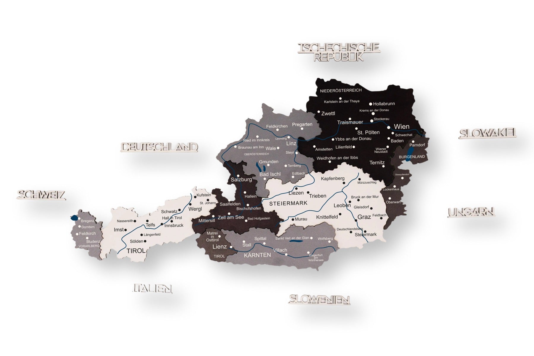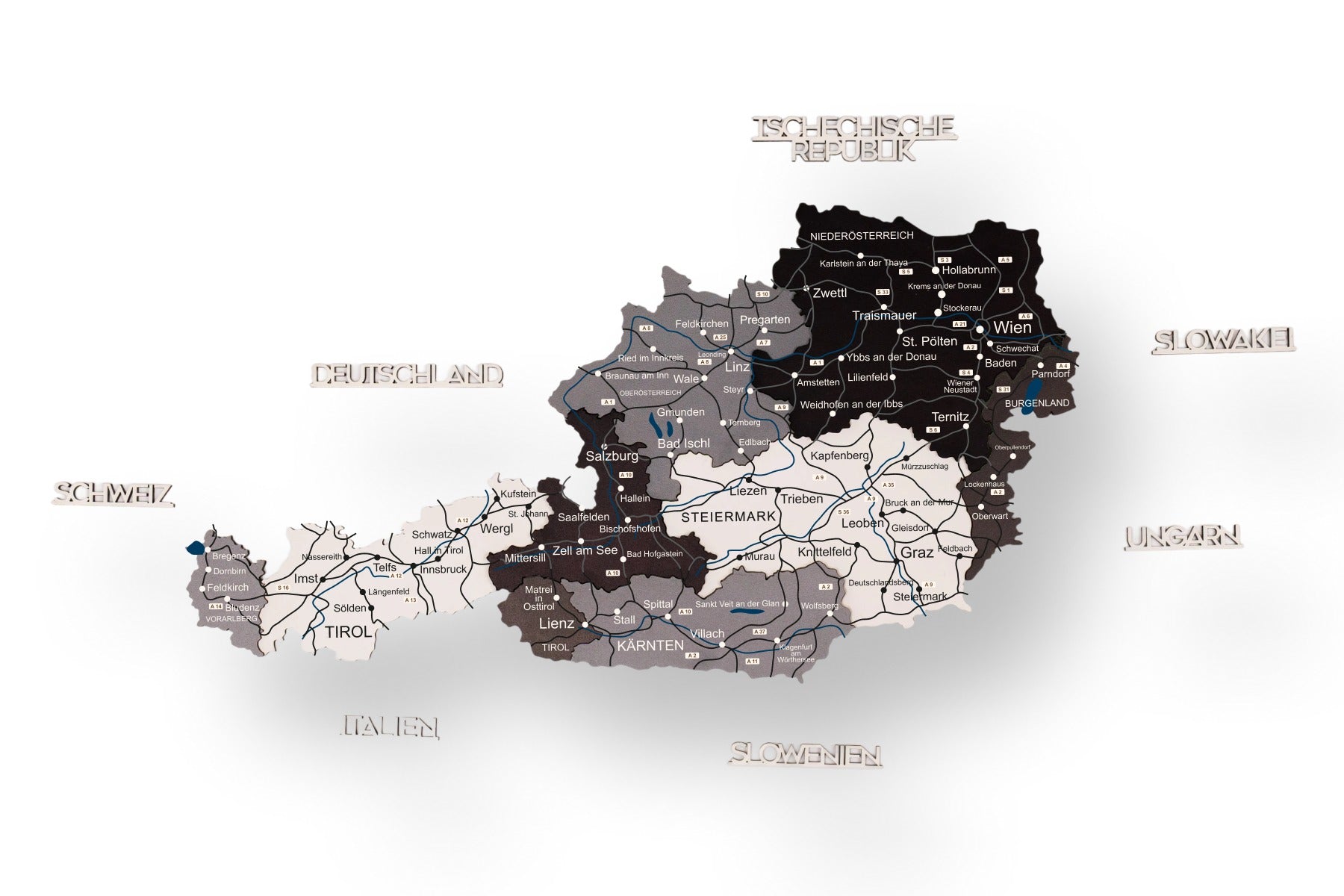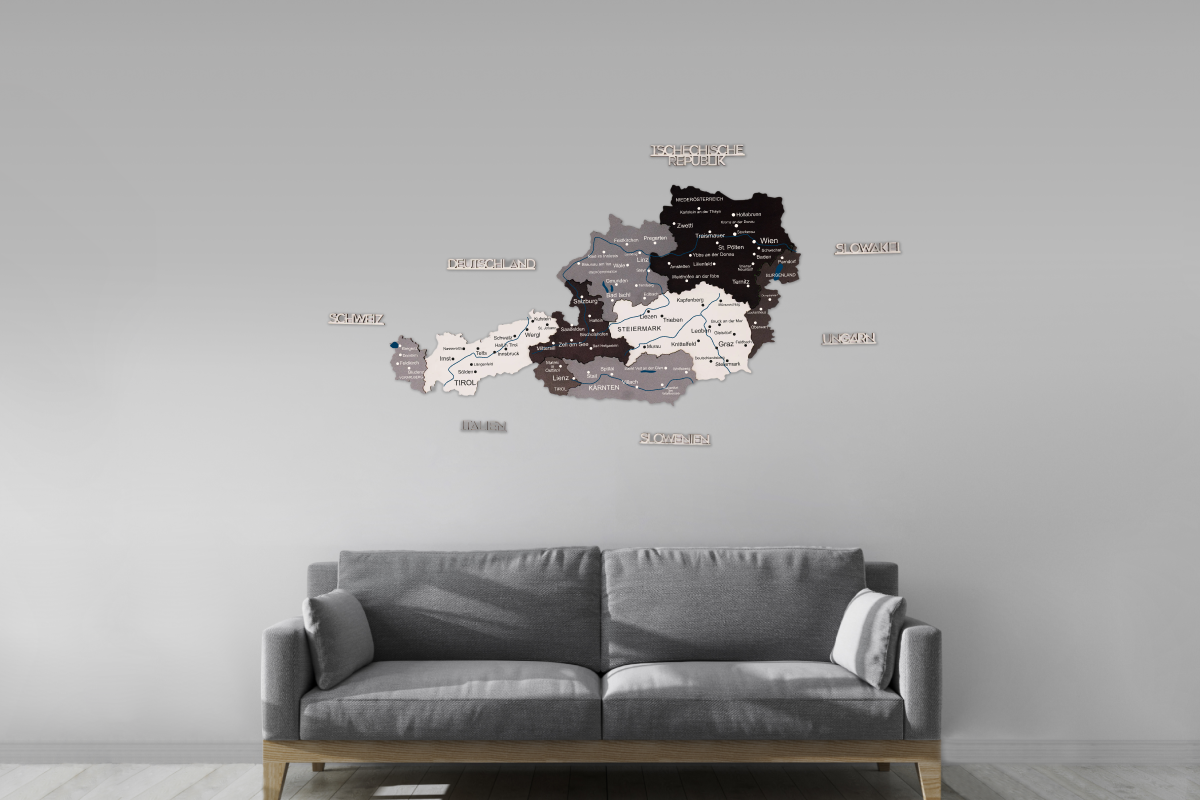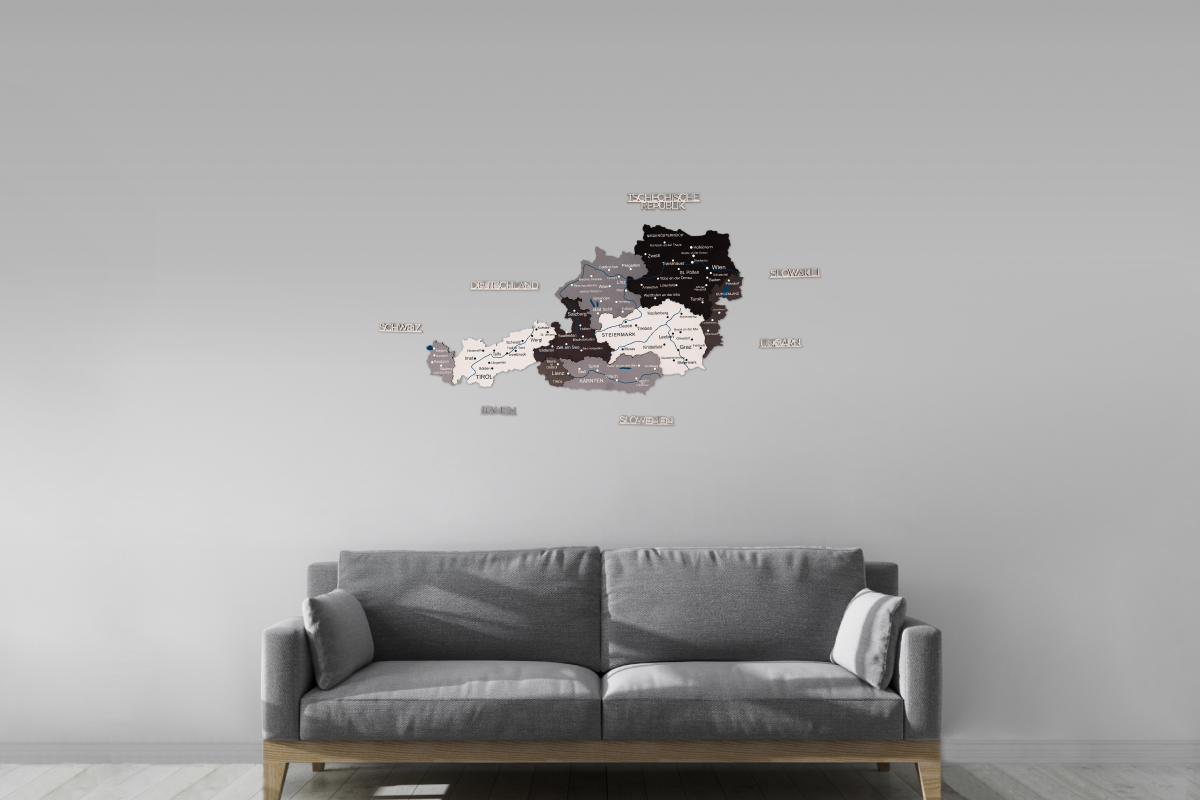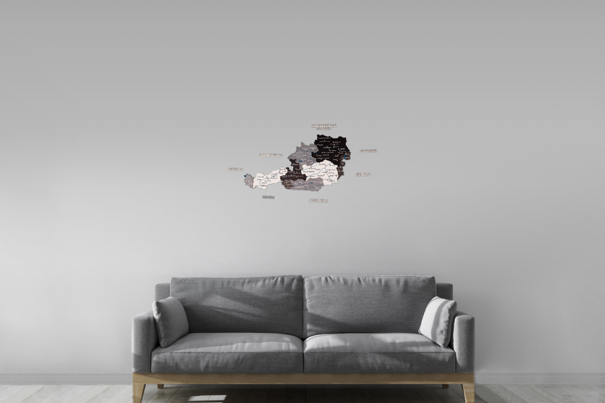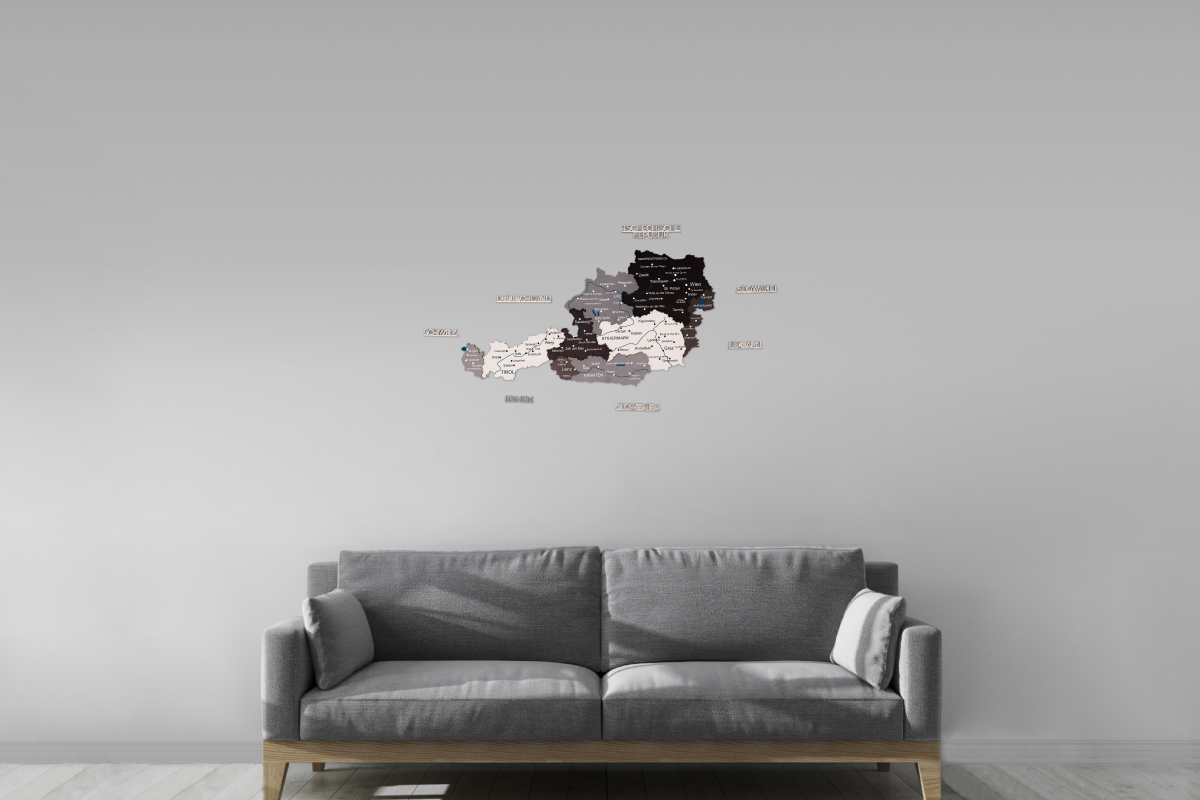 Die 3D Österreich Holzkarte Nordik ist ein modernes, handgefertigtes Wandkunstwerk aus mehrschichtigem Holz. Kühl-graue Farbtöne, präzise Lasergravuren und optionale Pins machen diese Österreich Karte Städte und Orte zu einem stilvollen Highlight für jeden Raum.