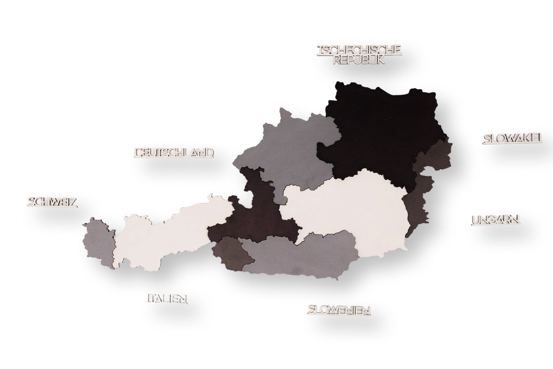 Nordik-Design mit harmonisch abgestimmten Grautönen, die die Länder Österreich Karte klar hervorheben. Durch die präzise Lasergravur entstehen feine geografische Details. Die natürliche Holzmaserung macht jede Karte einzigartig.