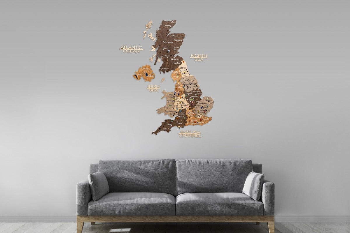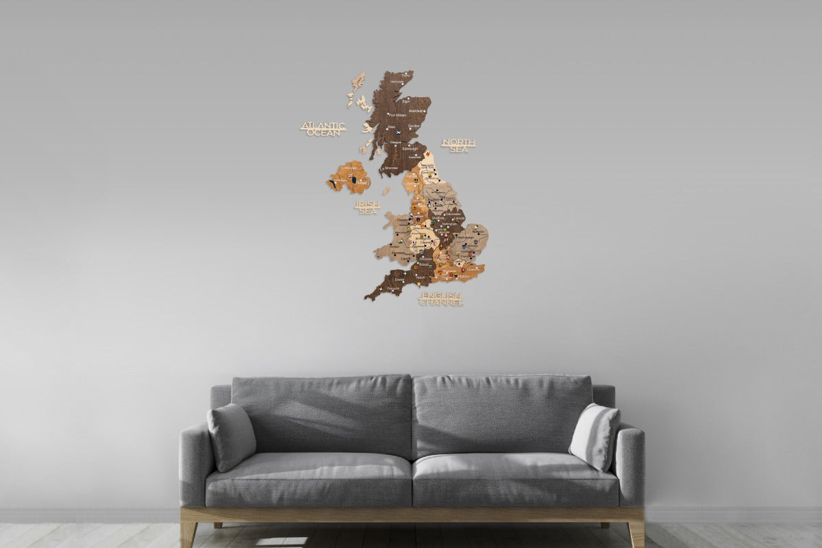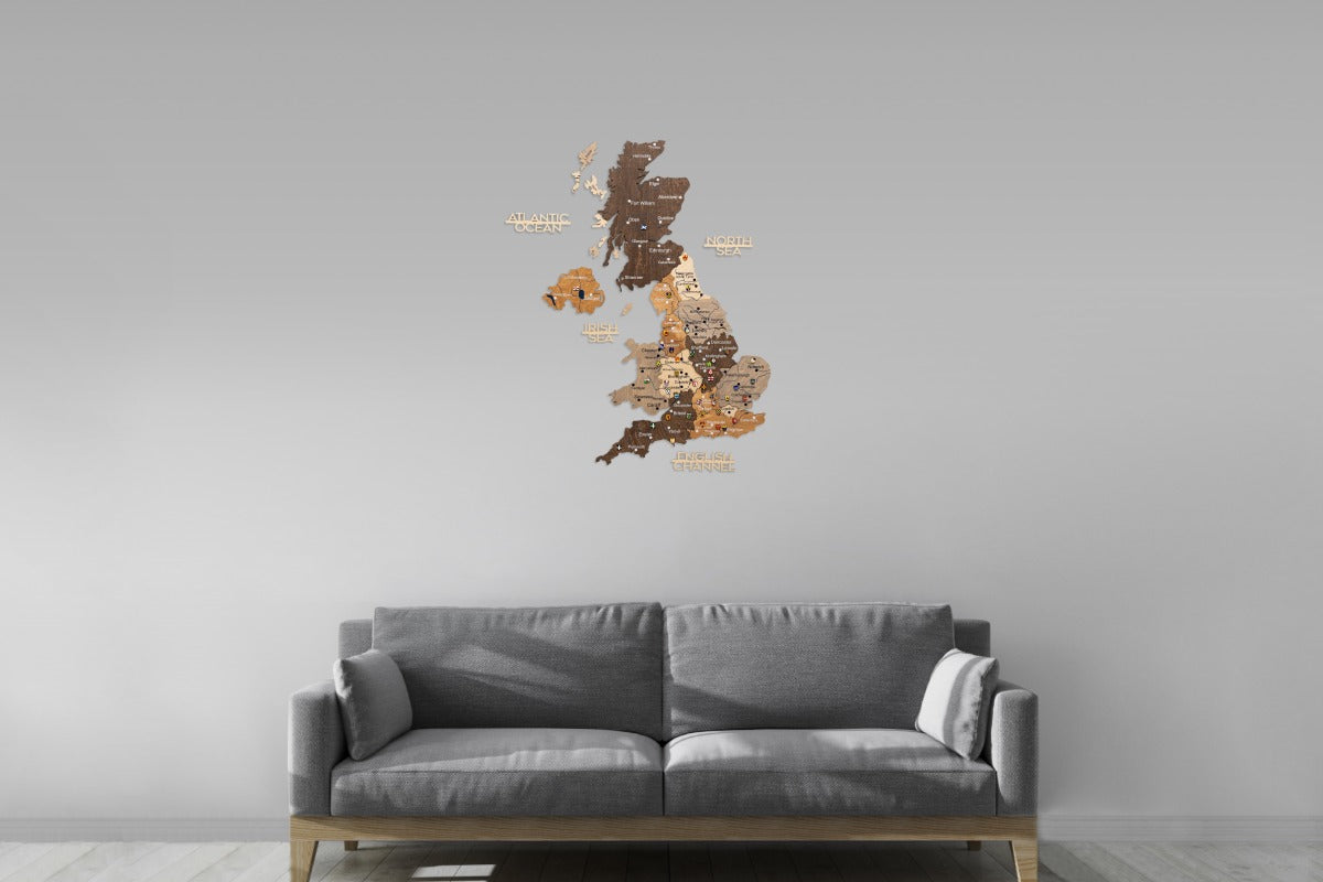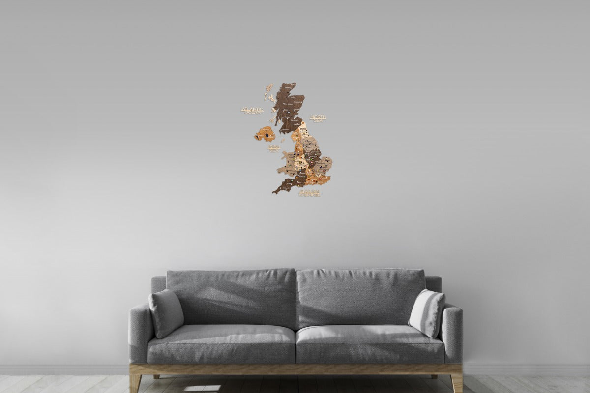 Diese Karte Vereinigtes Königreich zeichnet sich durch ein Multicolor-Design aus, bei dem die einzelnen Länder und Regionen durch unterschiedliche Holztöne hervorgehoben werden. Die 3D-Wirkung entsteht durch die sorgfältige Stapelung mehrerer Holzebenen, die der Karte eine beeindruckende, dynamische Tiefe verleihen. Das klare Design dient als eine umfassende Vereinigtes Königreich Großbritannien Karte.