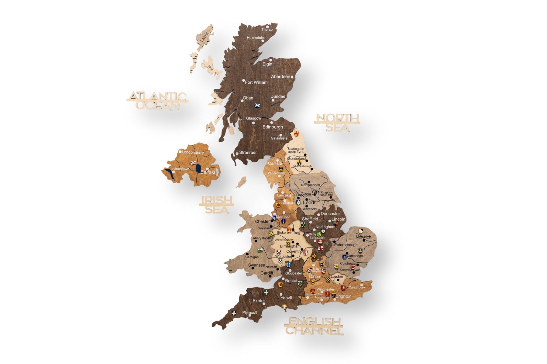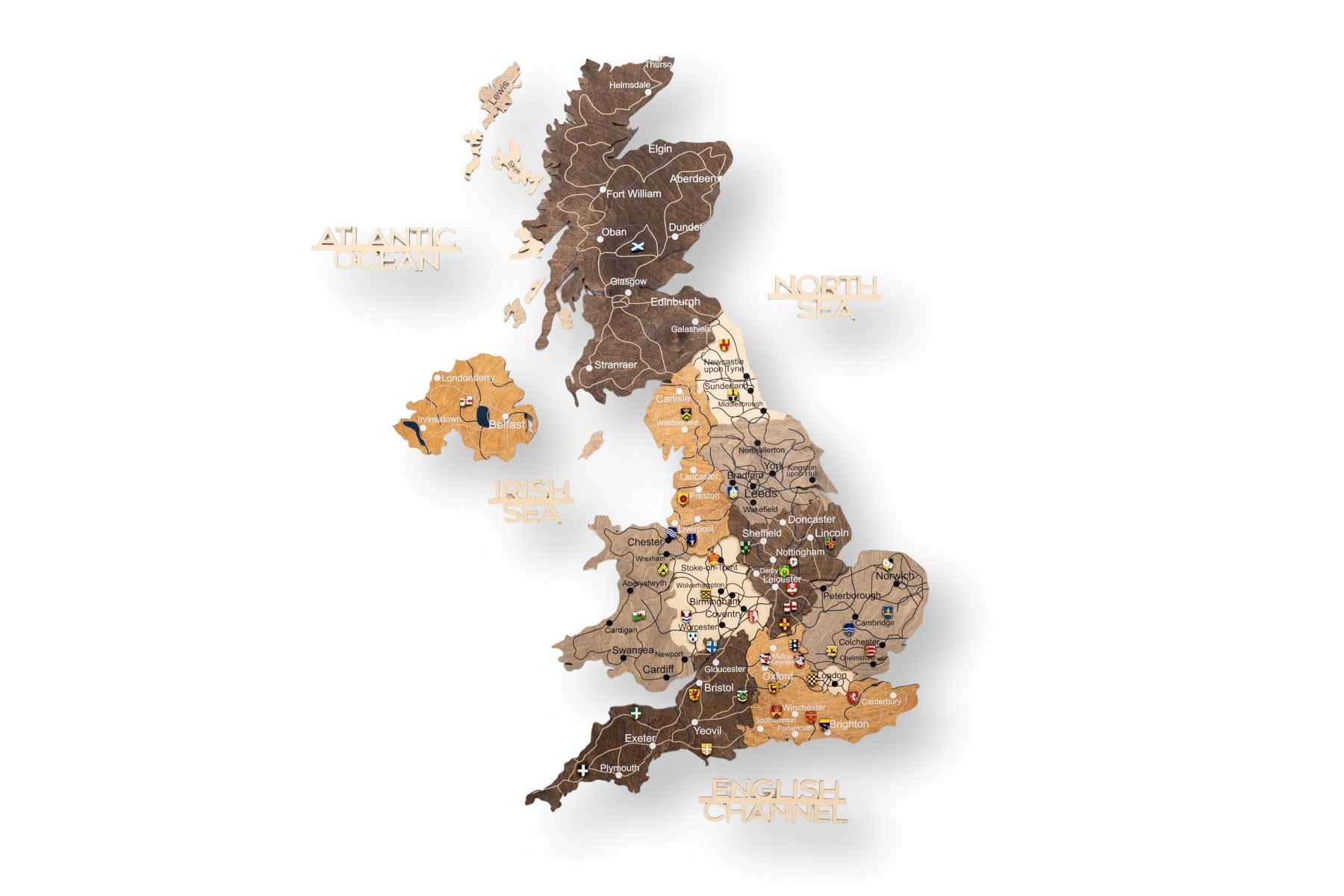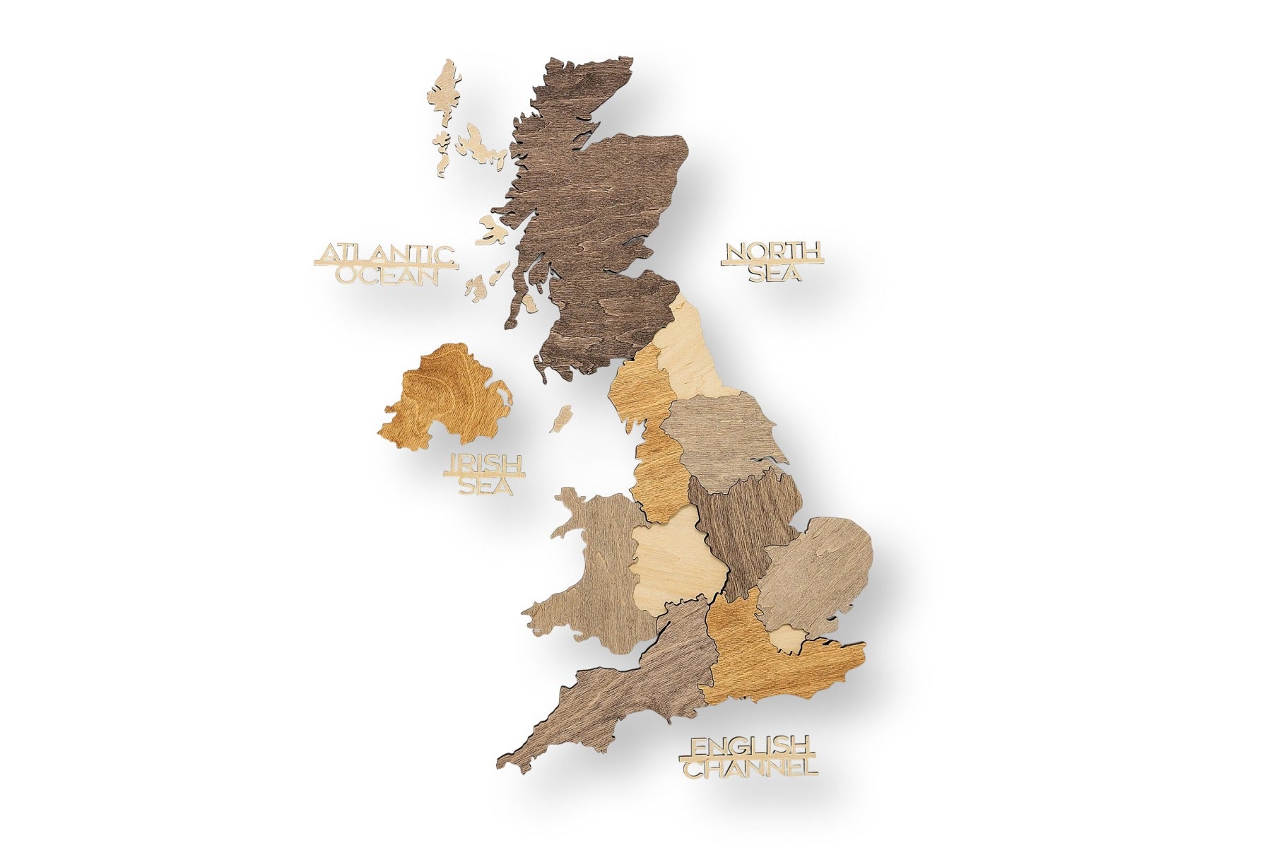 Diese Karte Vereinigtes Königreich zeichnet sich durch ein Multicolor-Design aus, bei dem die einzelnen Länder und Regionen durch unterschiedliche Holztöne hervorgehoben werden. Die 3D-Wirkung entsteht durch die sorgfältige Stapelung mehrerer Holzebenen, die der Karte eine beeindruckende, dynamische Tiefe verleihen. Das klare Design dient als eine umfassende Vereinigtes Königreich Großbritannien Karte.
