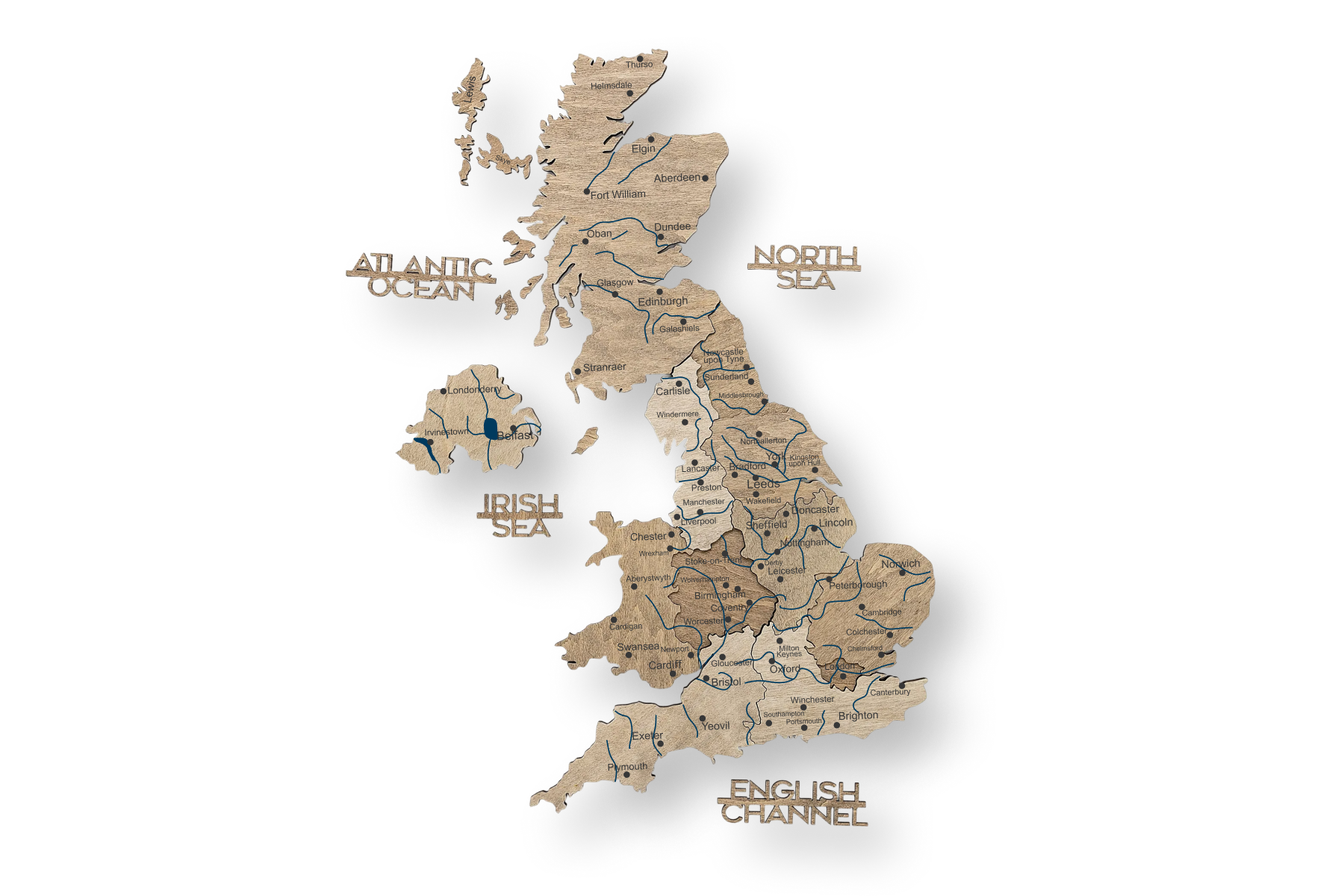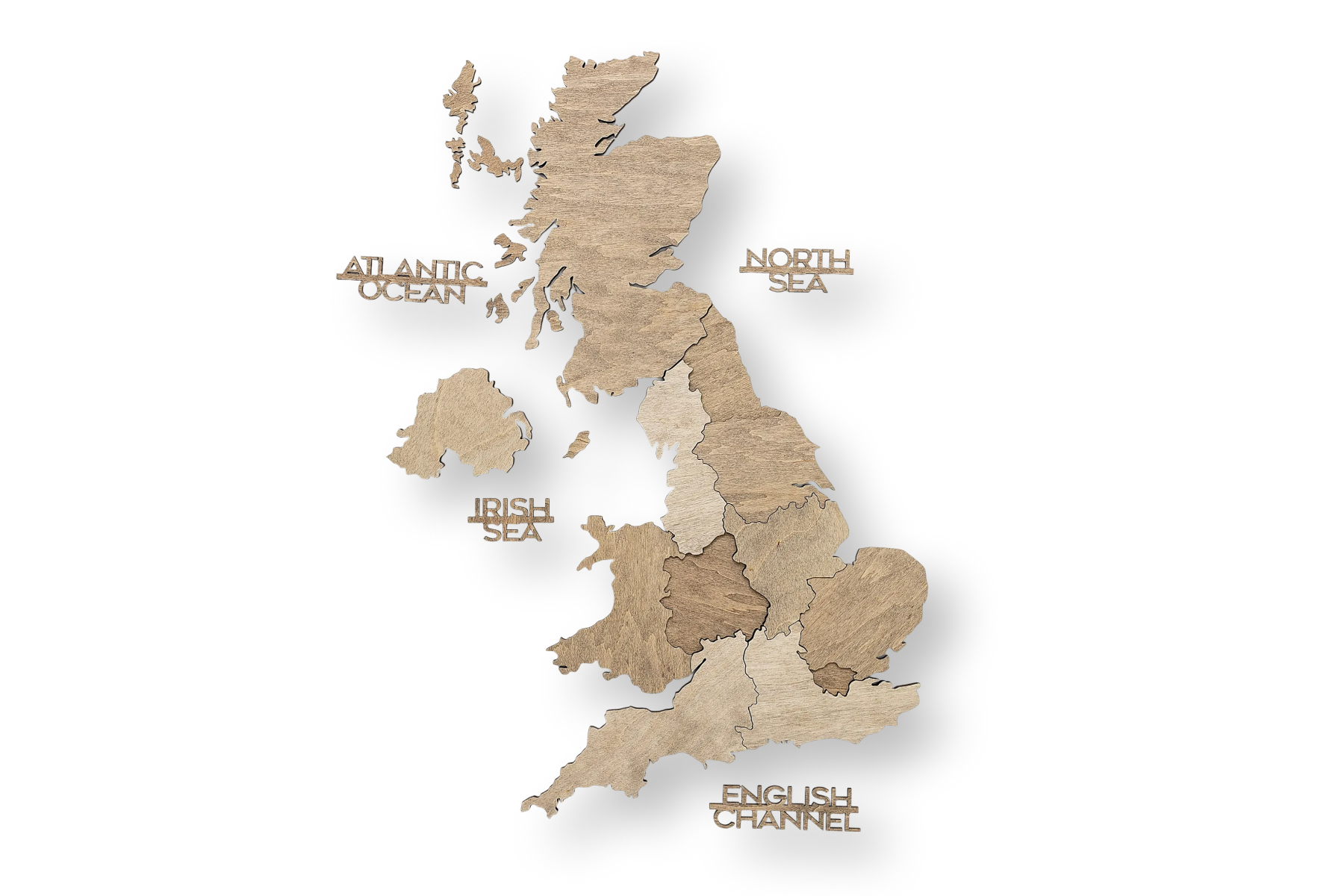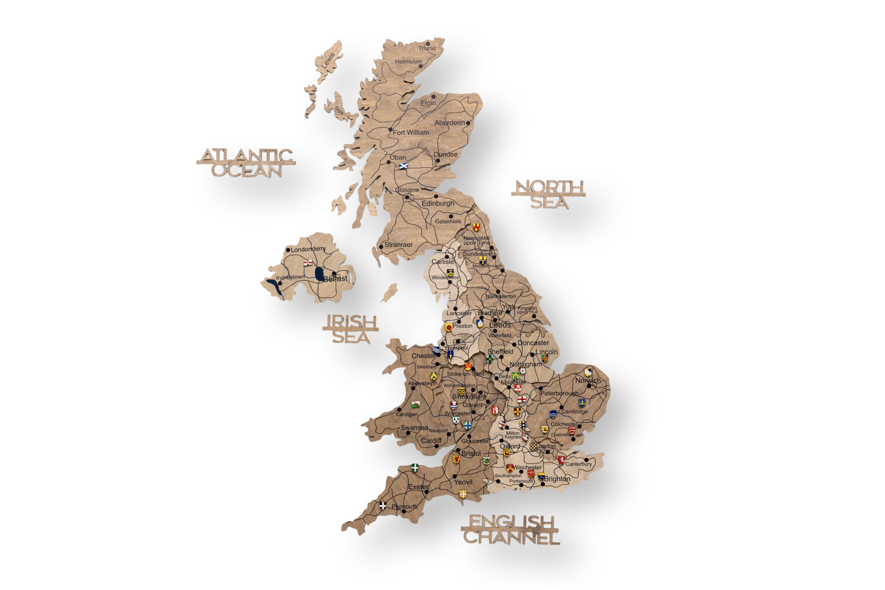 Das Terra-Finish zeichnet sich durch seine erdigen, warmen Holztöne aus, die sich perfekt in klassische und natürliche Einrichtungsstile einfügen. Die 3D-Wirkung entsteht durch die sorgfältige Stapelung mehrerer Holzebenen, die der Karte eine beeindruckende, dynamische Tiefe verleihen. Diese gestaffelte Konstruktion hebt die Gravuren der Großbritannien Karte Grafschaften und Karte Großbritannien mit Städten klar hervor.