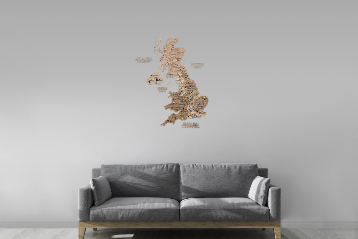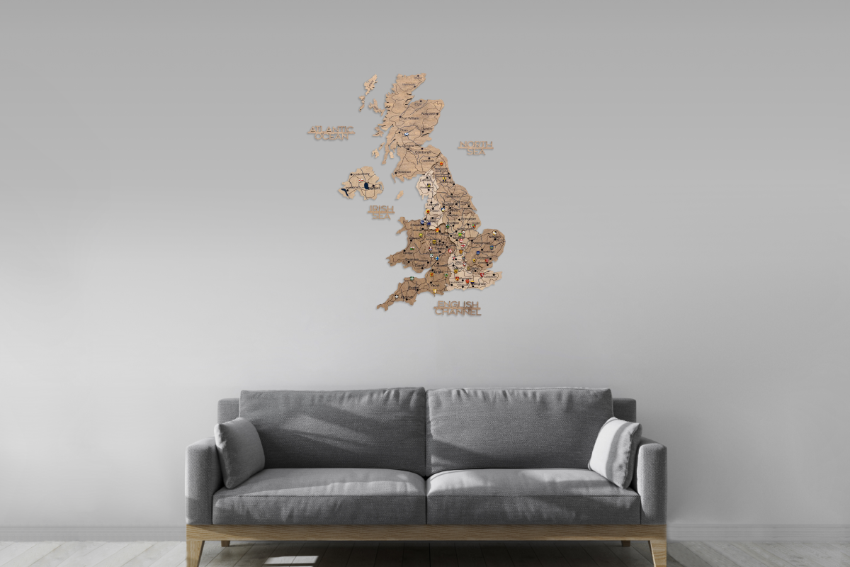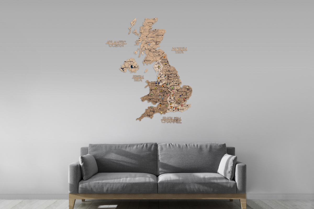 3D Vereinigtes Königreich Holzkarte – Terra: stilvolle Wandkarte mit farbigen Holzschichten, detaillierter Gravur und beeindruckender 3D-Tiefe. Ideal als Dekoration oder Reisetagebuch.