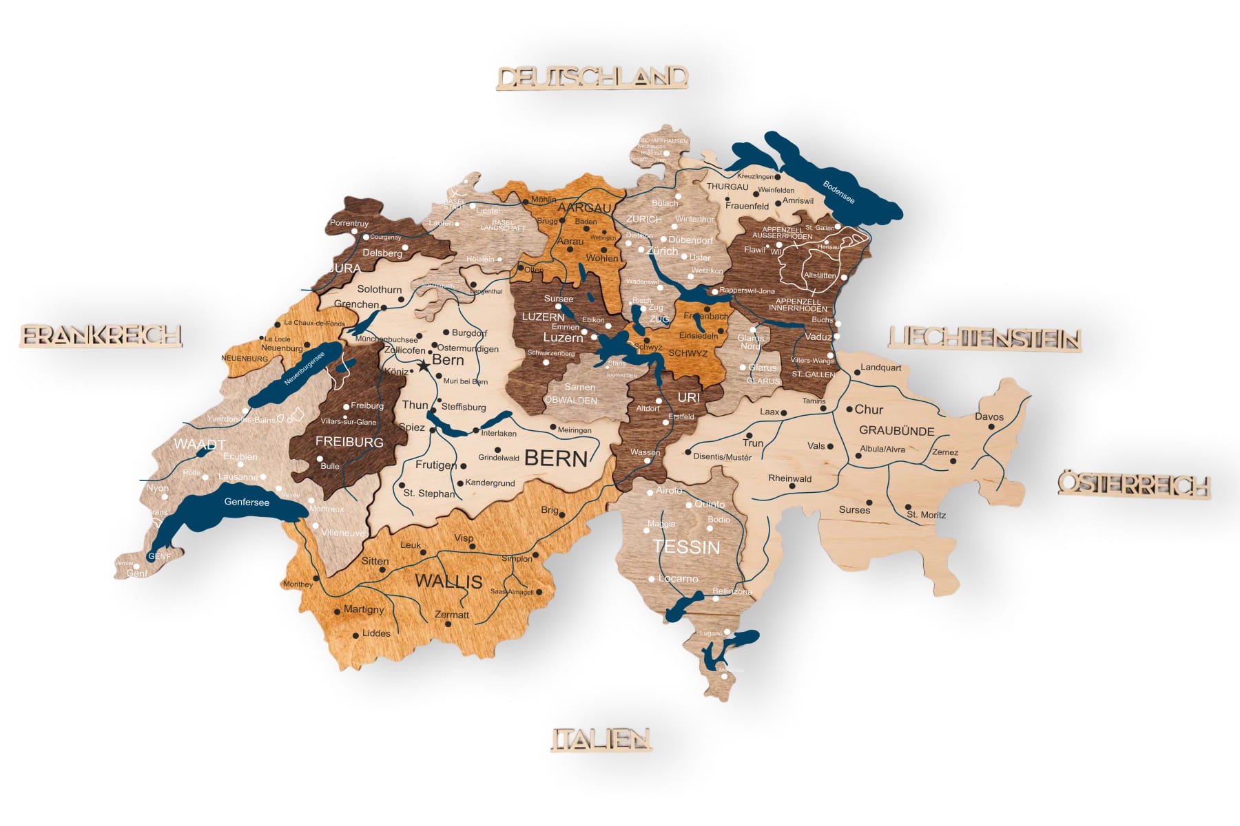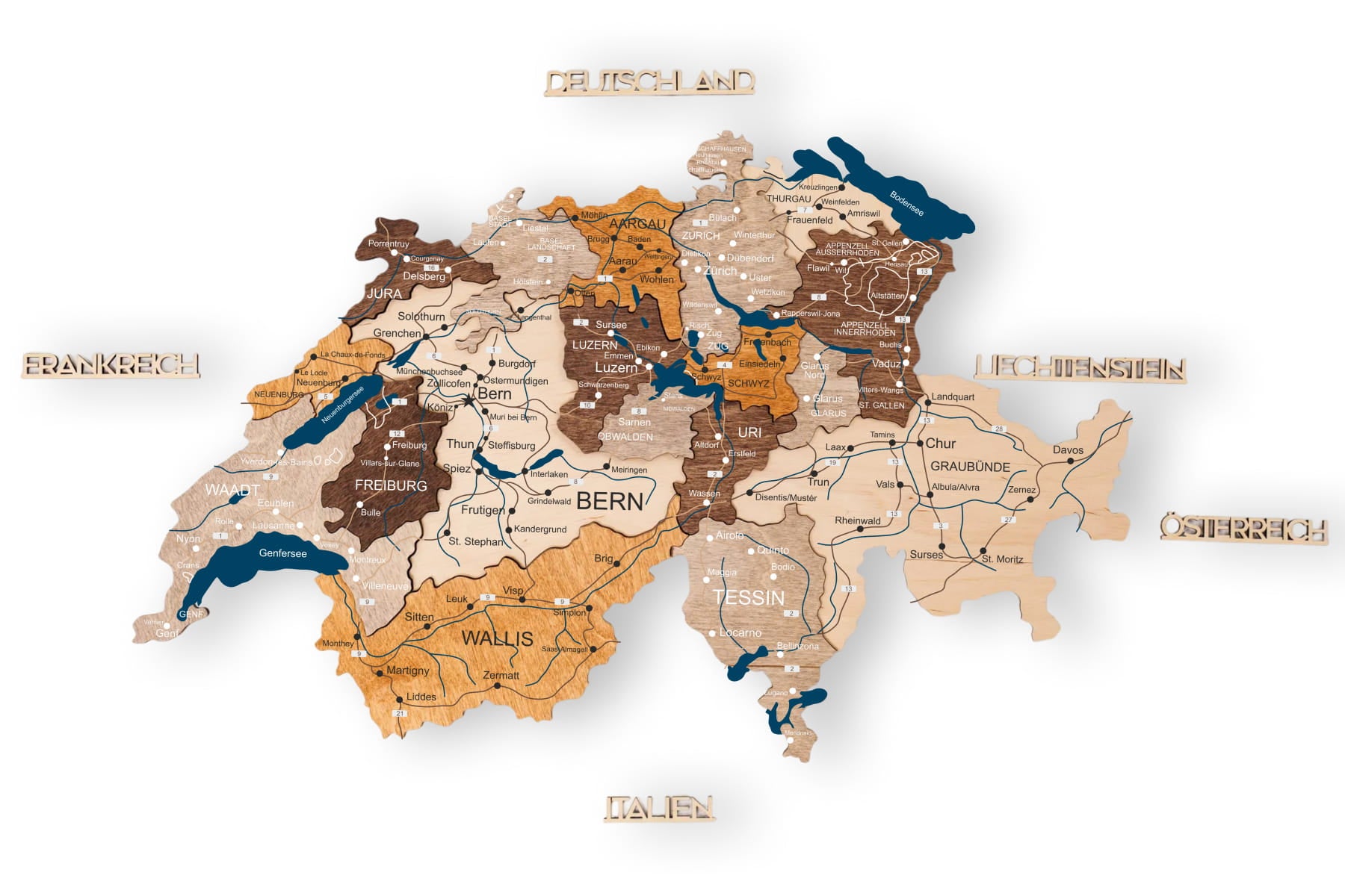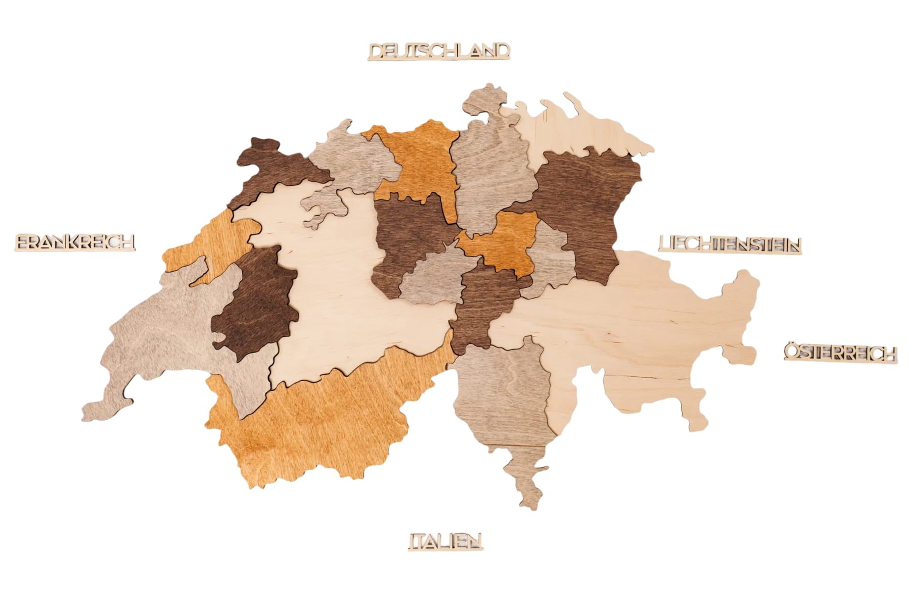 Personalisierte Holzkarte der Schweiz mit Kantonen von Enjoy The Wood. Diese mehrfarbige Wanddekoration hebt die Kantonsgrenzen und die topografische Tiefe durch geschichtetes Naturholz hervor. Wählen Sie Ihren bevorzugten Detailgrad: Blank (minimalistische Grenzen), Prime (Kantonsnamen und große Städte) oder Prime Plus (Städte und das Schweizer Straßennetz). Erhältlich in vier Größen und beschriftet auf Deutsch, Französisch oder Italienisch. Die leicht zusammenzusetzenden Teile machen die Installation zu einer unterhaltsamen und kreativen Erfahrung.