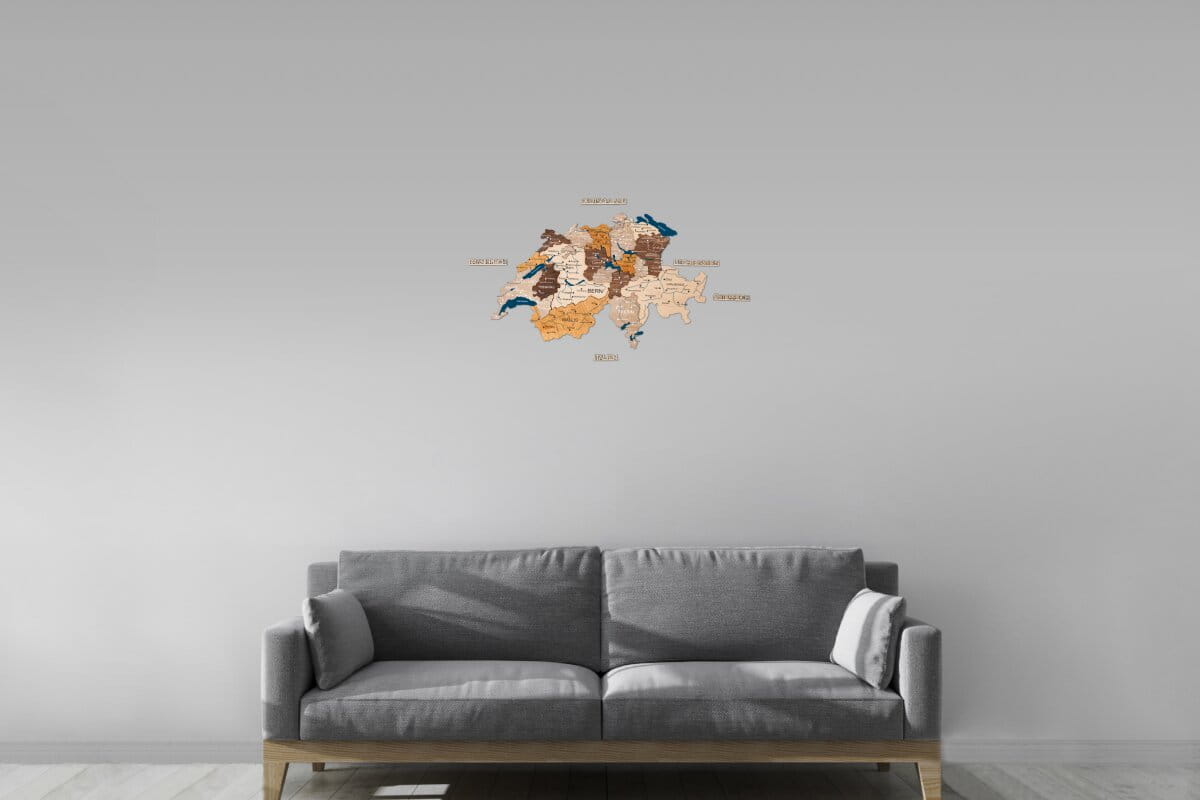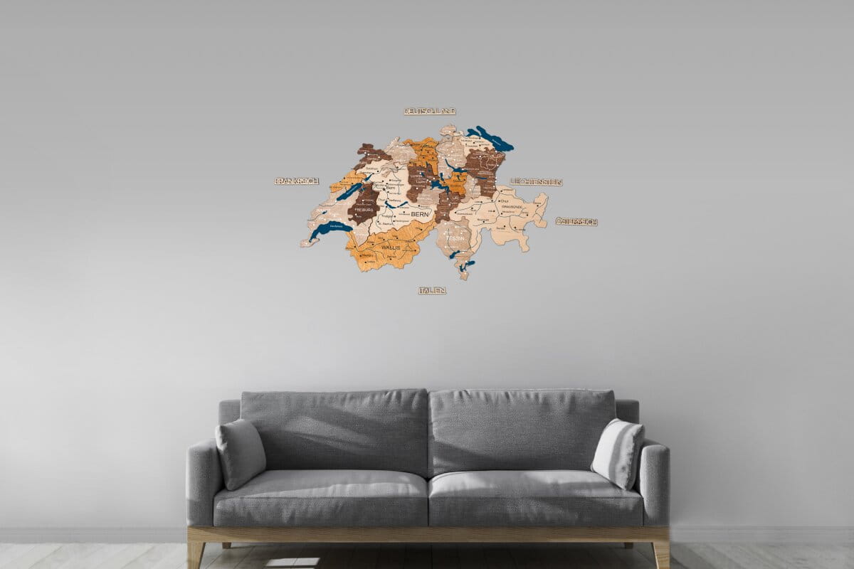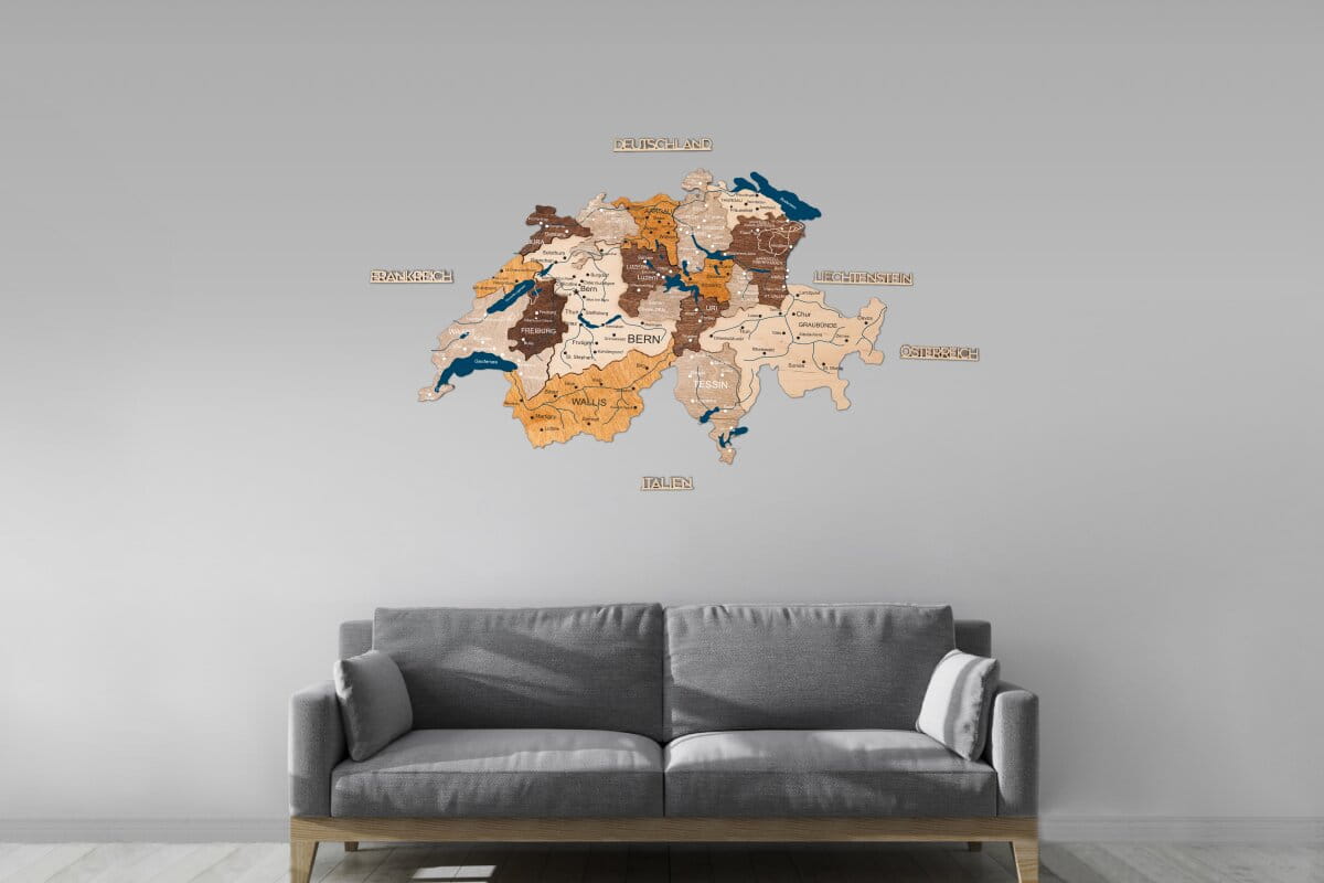 Mit der Multicolor-Edition von Enjoy The Wood entscheiden Sie sich für eine besonders dynamische Wanddekoration. Diese Karte der Schweiz mit Kantonen zeichnet sich durch die Verwendung verschiedener Holzschichten und Farbtöne aus, die die topografische Tiefe und die Grenzen der Kantone eindrucksvoll hervorheben. Jedes Element wird mit höchster Sorgfalt geschnitten, sodass eine detaillierte Karte Schweiz mit Kantonen entsteht, die nicht nur geografisch präzise ist, sondern auch durch ihre warme Oberfläche begeistert. Sie haben die Freiheit, die für Sie passende Detailtiefe zu wählen: