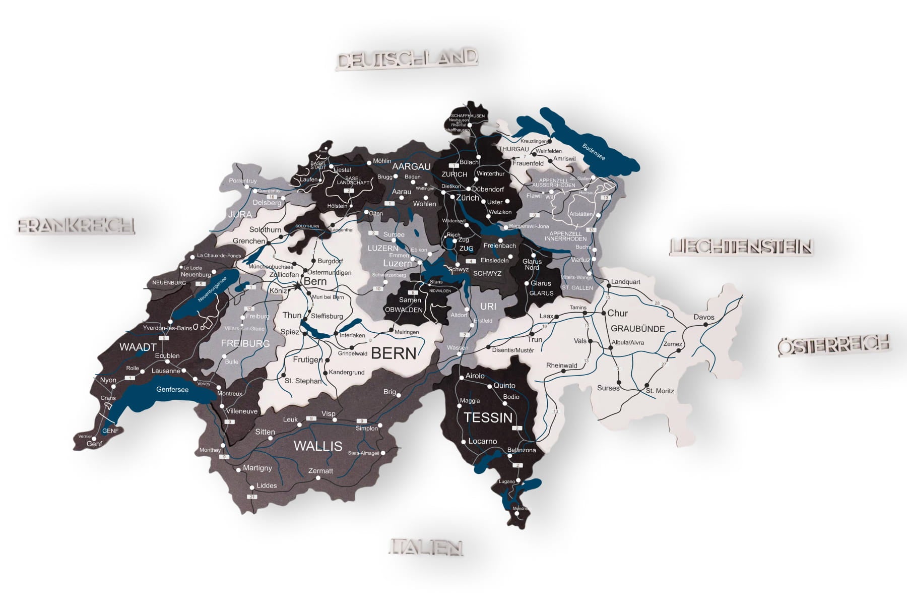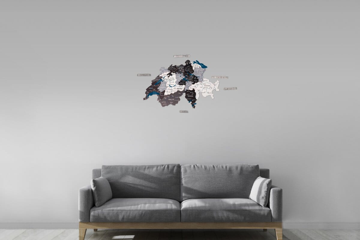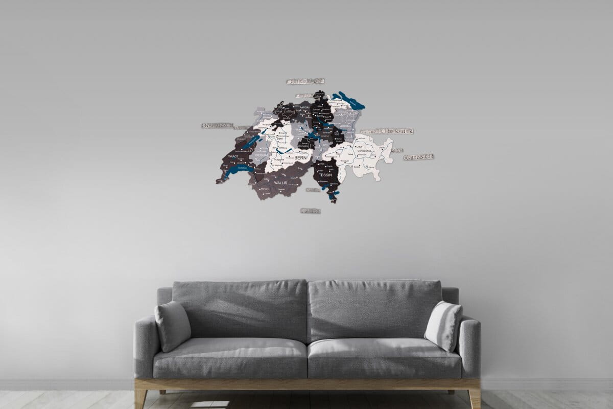 Mit dem Modell Nordik von Enjoy The Wood erhalten Sie eine stilvolle Schweiz übersichtskarte, die durch ihre präzisen Details und hochwertigen Materialien überzeugt. Die verschiedenen Grautöne und natürlichen Holznuancen dieser Edition heben die Grenzen der Kantone und die geografischen Besonderheiten der Schweiz auf subtile Weise hervor. Jede Karte wird mit Liebe zum Detail gefertigt, um ein harmonisches Gesamtbild an Ihrer Wand zu erzeugen. Sie können bei der Bestellung aus drei verschiedenen Detailstufen wählen, um die Tiefe der Informationen anzupassen: