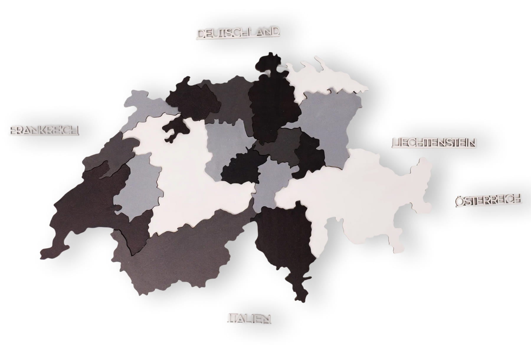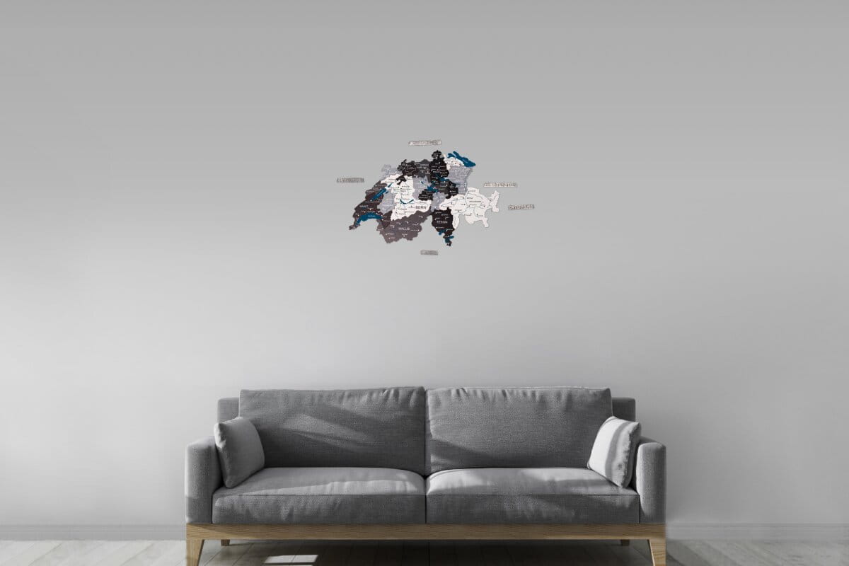Personalisierte Holzkarte der Schweiz mit Kantonen von Enjoy The Wood. Diese mehrfarbige Wanddekoration hebt die Kantonsgrenzen und die topografische Tiefe durch geschichtetes Naturholz hervor. Wählen Sie Ihren bevorzugten Detailgrad: Blank (minimalistische Grenzen), Prime (Kantonsnamen und große Städte) oder Prime Plus (Städte und das Schweizer Straßennetz). Erhältlich in vier Größen und beschriftet auf Deutsch, Französisch oder Italienisch. Die leicht zusammenzusetzenden Teile machen die Installation zu einer unterhaltsamen und kreativen Erfahrung.