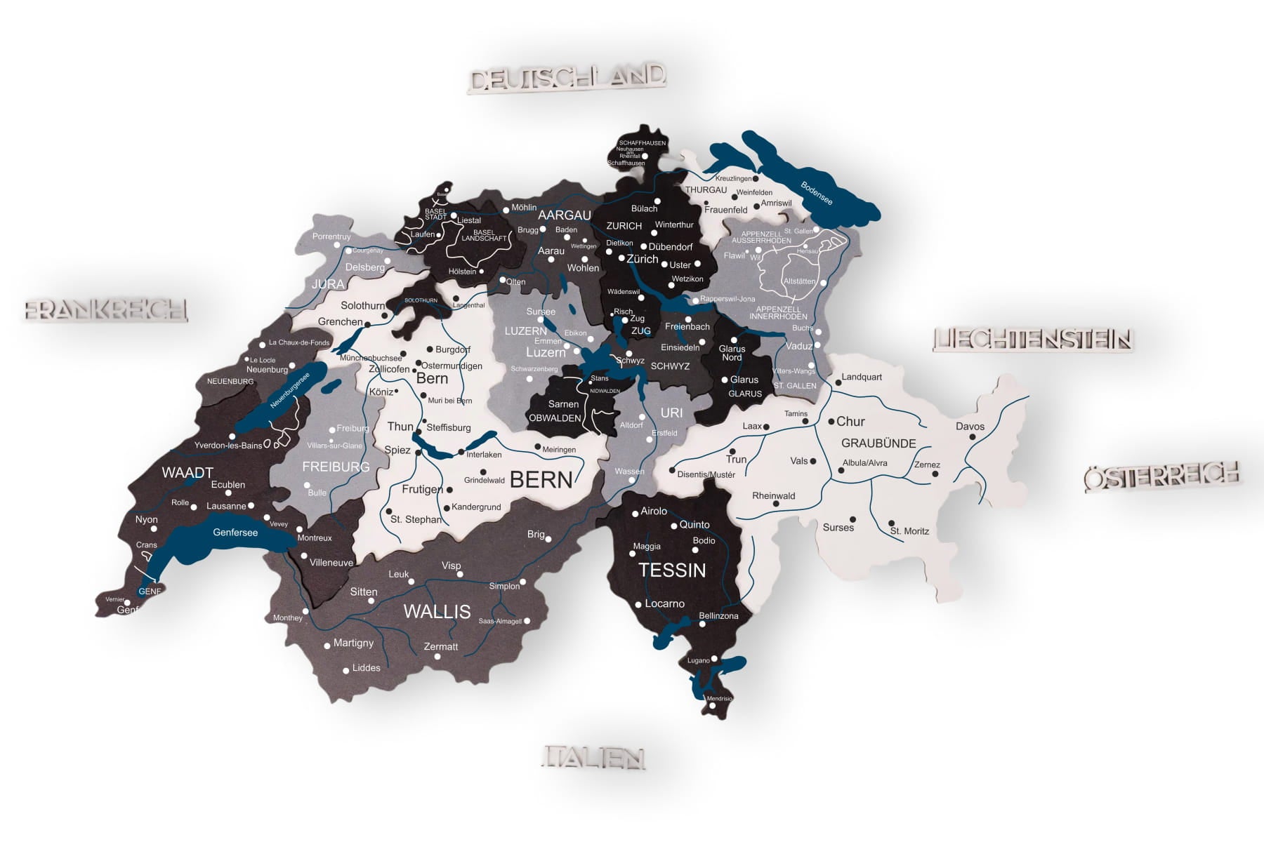 Die 3D Schweizkarte aus Holz – Nordik besticht durch ihre kühlen, skandinavisch inspirierten Farbtöne, die jedem Raum eine moderne und ruhige Atmosphäre verleihen. Diese handgefertigte Karte ist die ideale Wahl für Minimalisten, die eine ästhetische Verbindung zwischen natürlichem Holz und zeitgenössischem Design suchen.