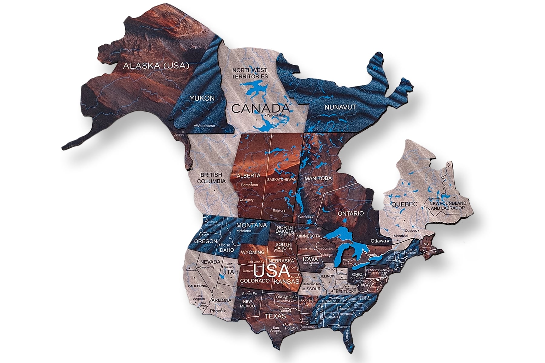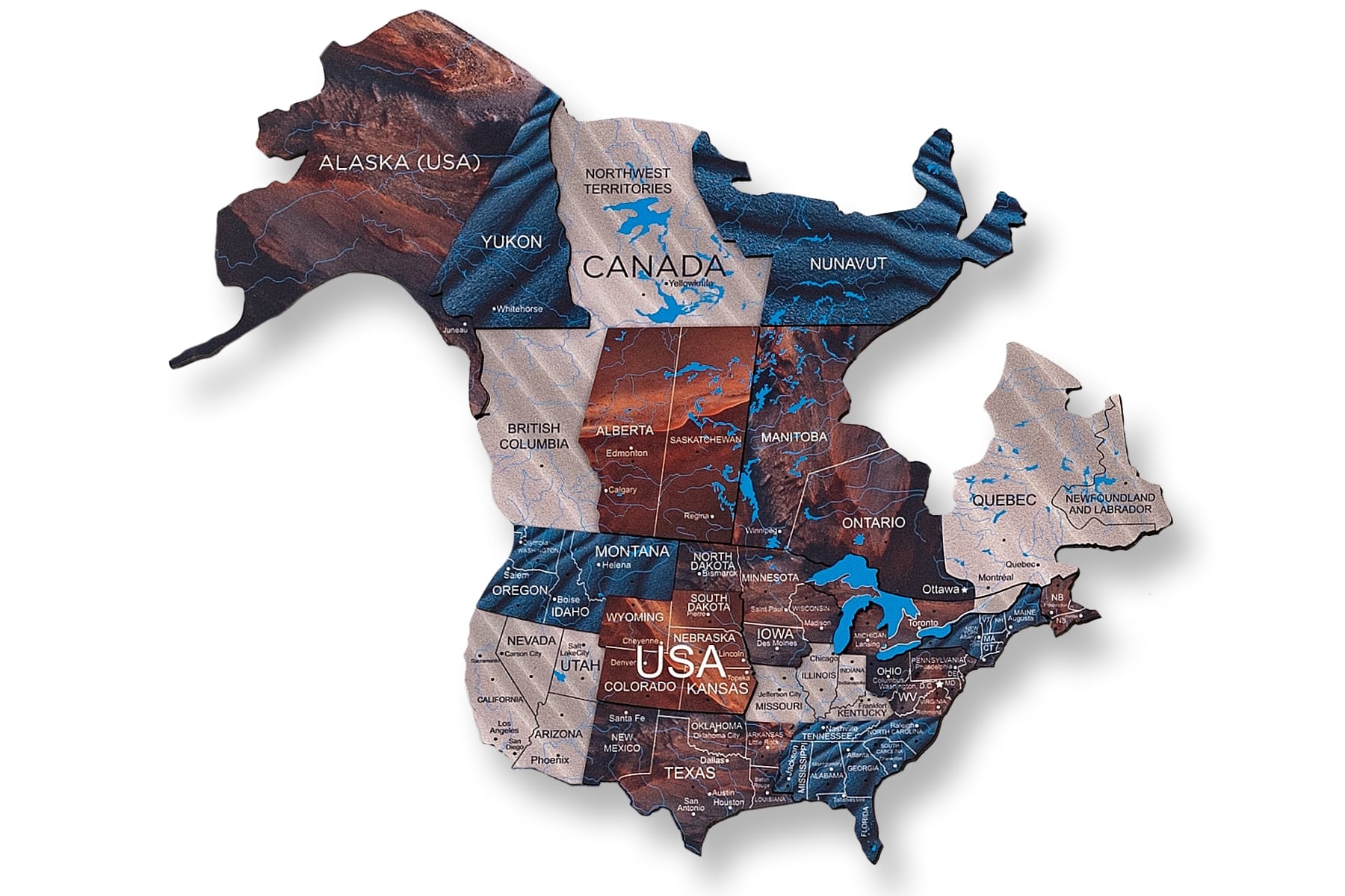 Das detailreiche Design zeigt zahlreiche Elemente wie Ländernamen und Grenzen, Hauptstädte, Städte, Flüsse, Seen und Gebirgsketten. Einige kleinere Inseln und Staaten wurden bewusst weggelassen, wodurch die Karte nicht für Bildungszwecke geeignet ist. Ergänze deine Holzweltkarte am besten mit den passenden hölzernen Flaggen-Steckpins, die du ebenfalls in den Warenkorb legen kannst.